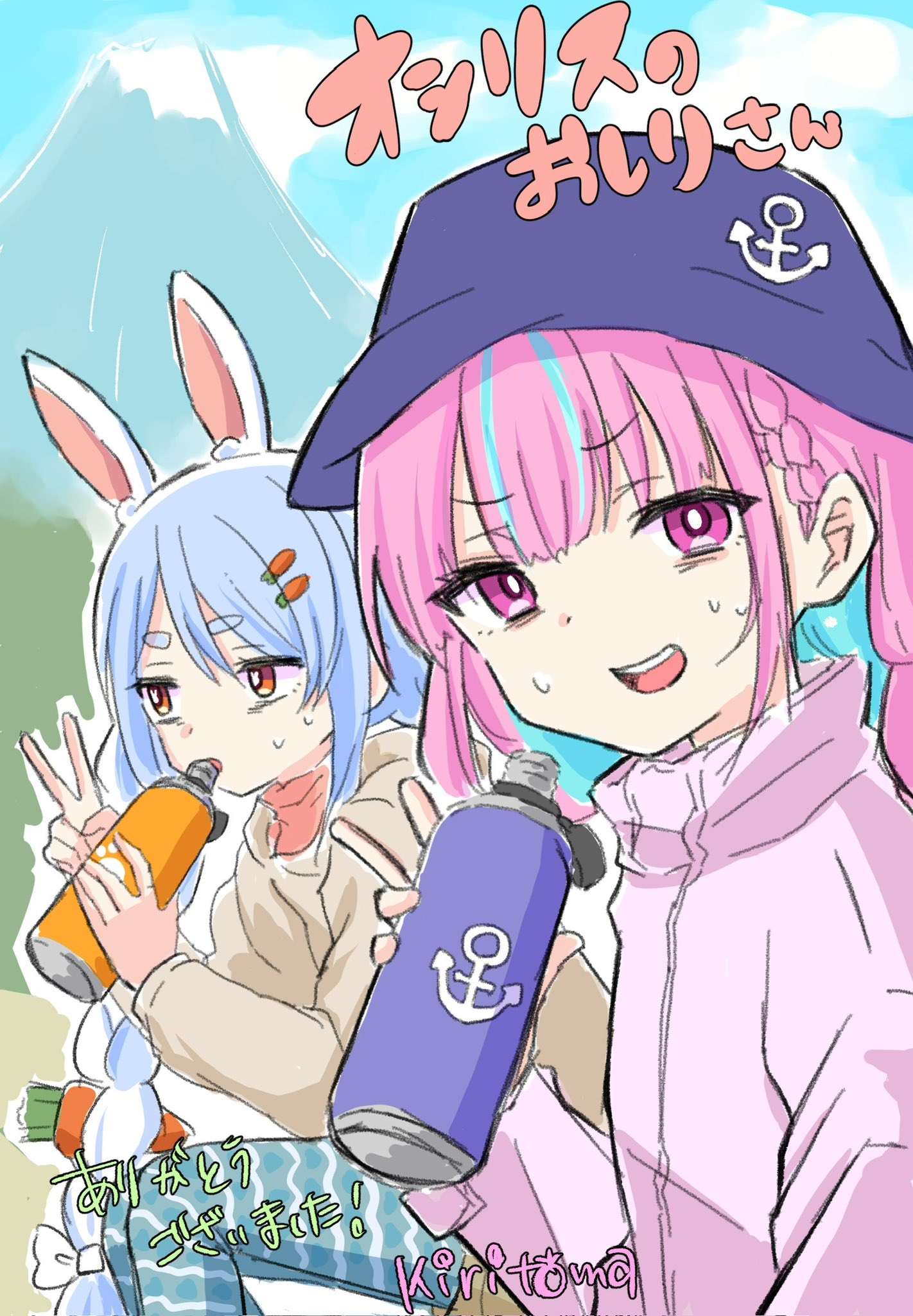 2girls anchor_symbol animal_ear_fluff animal_ears blue_hair blue_sky bottle bow braid brown_eyes brown_jacket carrot_hair_ornament cloud commentary_request day food-themed_hair_ornament hair_between_eyes hair_bow hair_ornament hat highres holding holding_bottle hololive hood hood_down hooded_jacket jacket kiritoma long_hair minato_aqua mountain multicolored_hair multiple_girls outdoors pants pink_hair pink_jacket purple_eyes purple_hat rabbit-shaped_pupils rabbit_ears short_eyebrows signature sitting sky striped_clothes striped_pants symbol-shaped_pupils thick_eyebrows translation_request twin_braids twintails two-tone_hair usada_pekora v-shaped_eyebrows very_long_hair virtual_youtuber white_bow