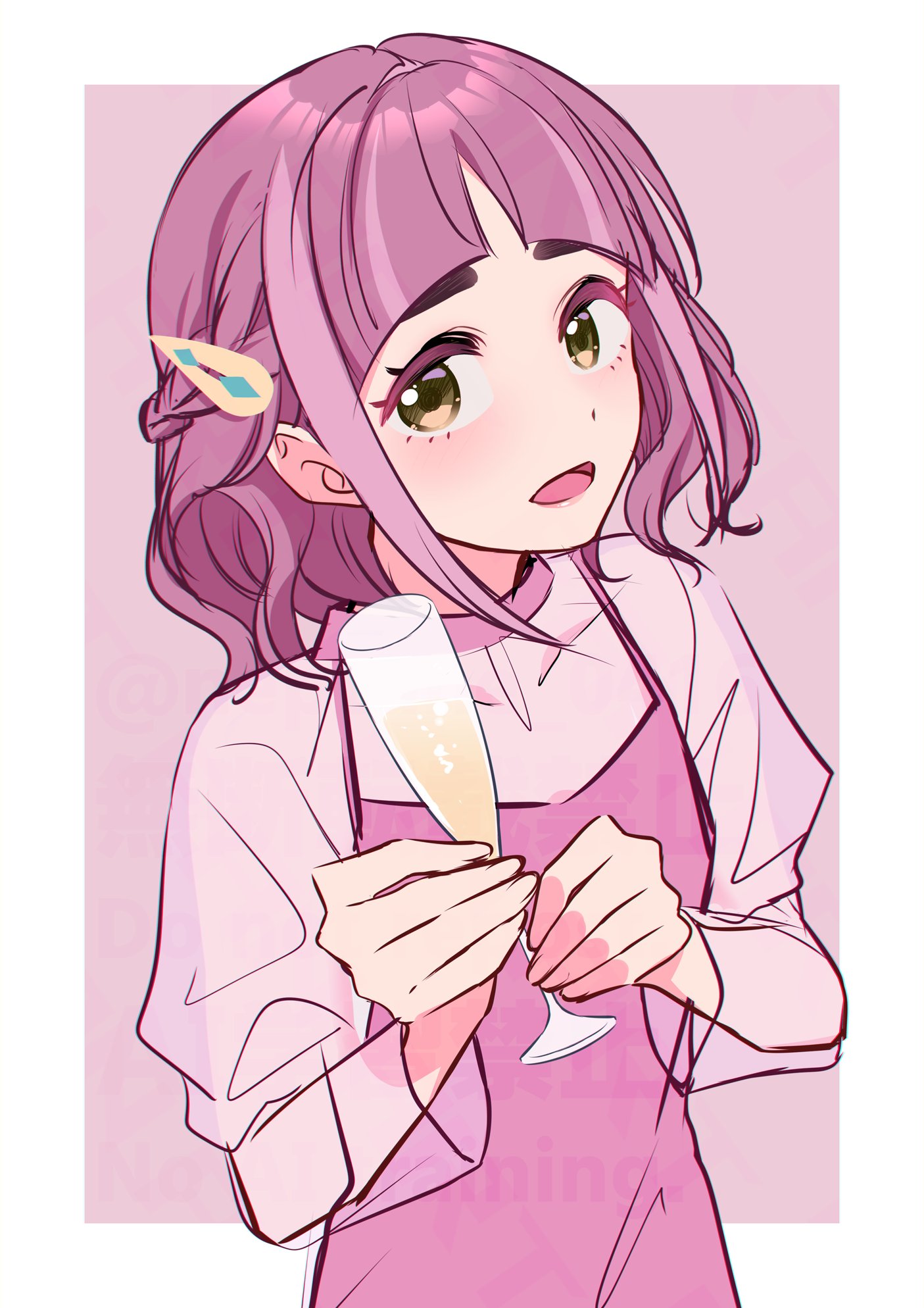 1girl :d alternate_costume alternate_hairstyle arched_bangs brown_eyes commentary_request cup dress drinking_glass hair_ornament hairclip highres holding holding_cup lacey_(pokemon) looking_at_viewer nintendo open_mouth pink_dress pink_hair pokemon pokemon_sv saotome_(neptune_0416) see-through_clothes see-through_sleeves short_hair smile solo upper_body wine_glass