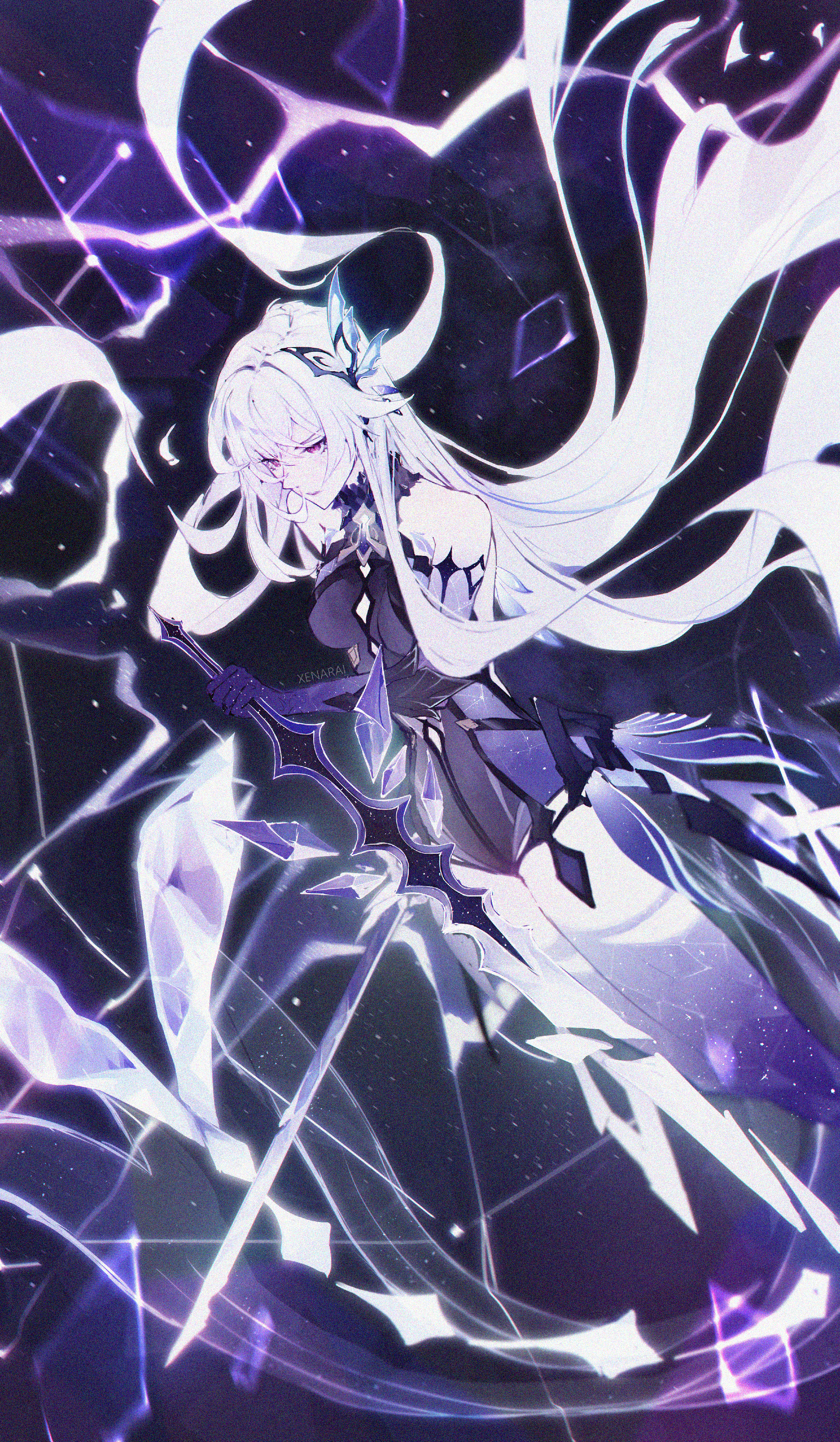 1girl absurdres crystal_shards fins fish_tail genshin_impact glass_shards highres holding holding_sword holding_weapon long_hair skirk_(genshin_impact) solo star_(sky) sword tail weapon white_hair xena_rai