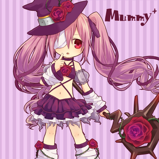 bandage_over_one_eye bare_shoulders breasts character_name dress emil_chronicle_online flower frilled_dress frilled_skirt frills hair_ribbon hand_on_own_cheek hand_on_own_face hat holding holding_staff long_hair mummy_alma navel purple_hair purple_ribbon red_eyes ribbon rose skirt small_breasts staff twintails yellow_(artist)