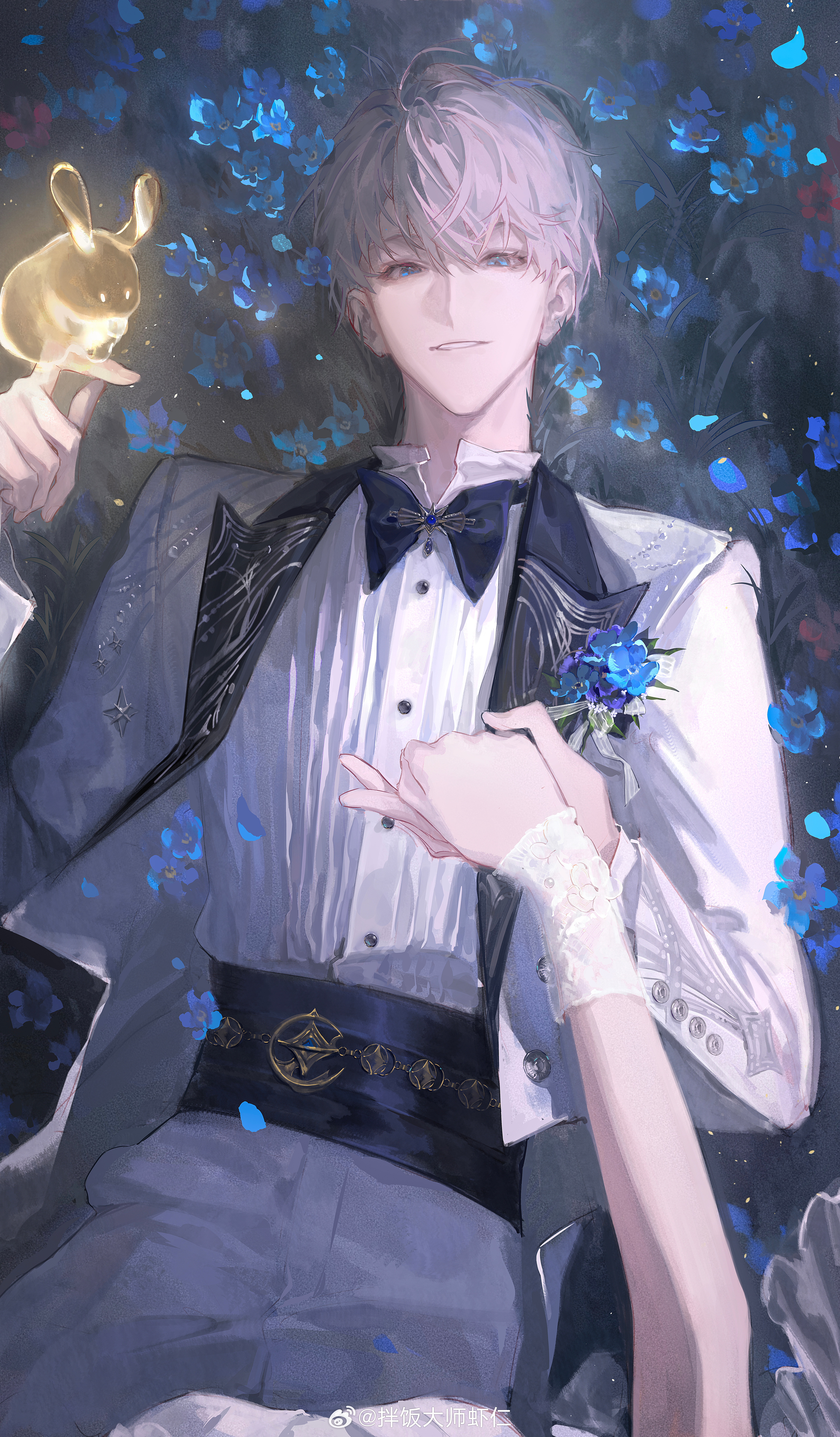 1boy absurdres aqua_eyes banfan_dashi_xiaren black_bow black_bowtie black_collar blue_flower bow bowtie collar collared_jacket cowboy_shot dress_shirt eyes_visible_through_hair female_pov flower forget-me-not_(flower) grass grey_hair grey_jacket grey_pants hair_over_eyes highres jacket looking_at_viewer love_and_deepspace male_focus on_ground pants parted_lips pov shirt short_hair suit_jacket teeth watermark weibo_watermark xavier_(love_and_deepspace)