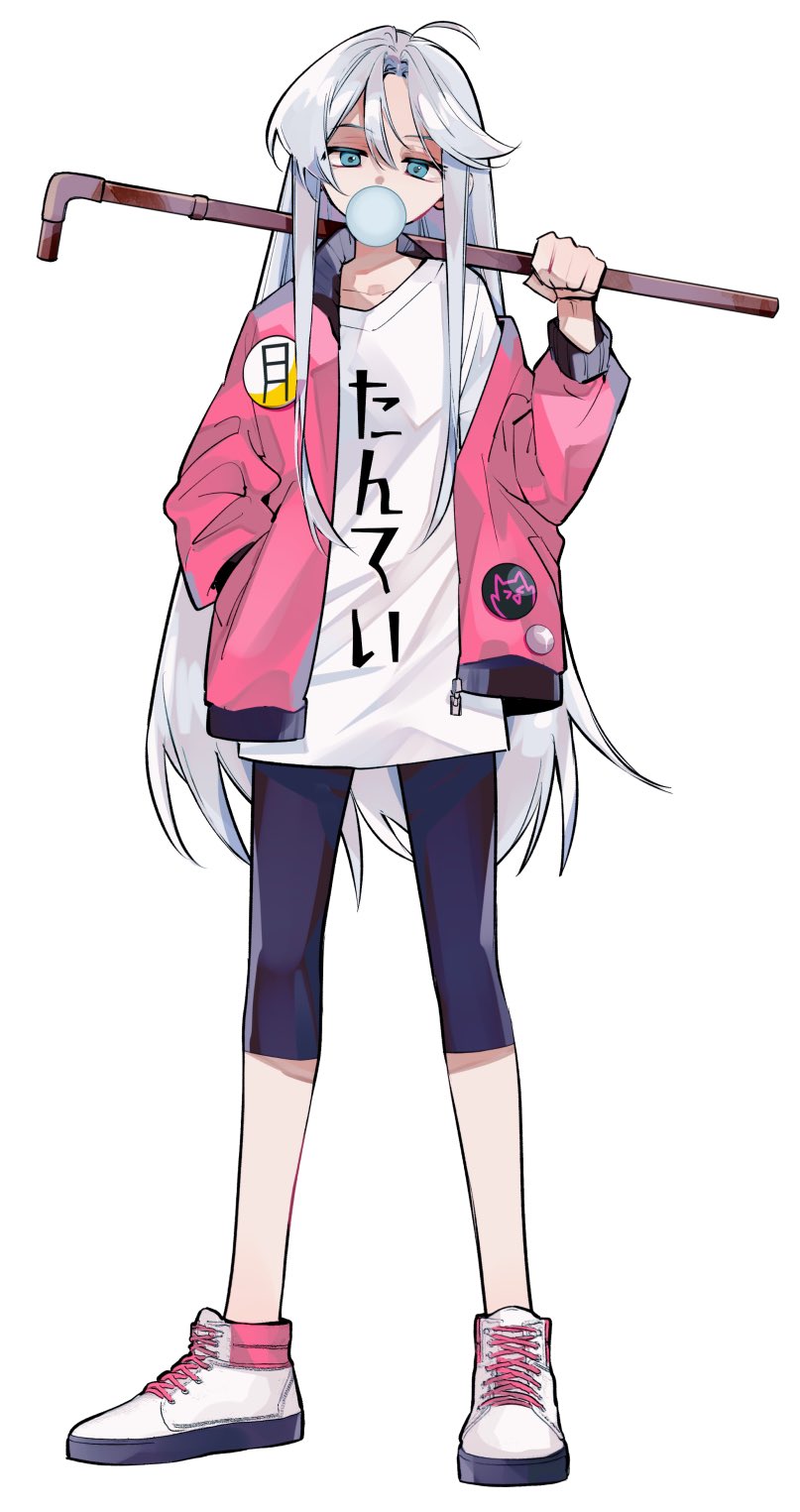 1girl ahoge aqua_eyes asymmetrical_bangs black_shorts black_trim chewing_gum crowbar curtained_hair flipped_bangs full_body grey_hair half-closed_eyes hand_in_pocket hand_up highres holding holding_crowbar jacket long_hair long_sleeves looking_ahead open_clothes open_jacket original osr_00_osr over_shoulder oversized_clothes oversized_shirt pink_jacket print_shirt shirt shoes shorts side_part sidelocks simple_background single_off_shoulder solo standing straight_hair t-shirt tachi-e clothes_writing very_long_hair weapon weapon_over_shoulder white_background white_shirt white_shoes