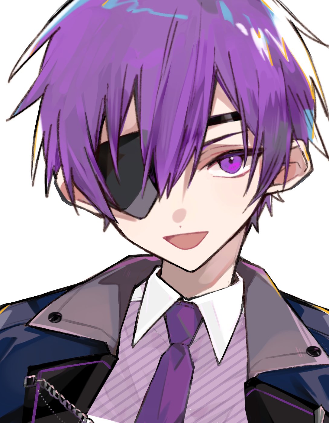 1boy :d bishounen black_jacket close-up collar collared_shirt diagonal-striped_clothes diagonal-striped_shirt dot_nose double-parted_bangs eyepatch hair_between_eyes highres jacket lapels light_smile looking_ahead male_focus necktie open_clothes open_jacket open_mouth osr_00_osr piece_a_part portrait purple_eyes purple_hair purple_necktie purple_shirt purple_theme shirt short_hair sidelighting simple_background smile solo striped_clothes tsurime white_background white_collar wing_collar yoshizuki_meguru