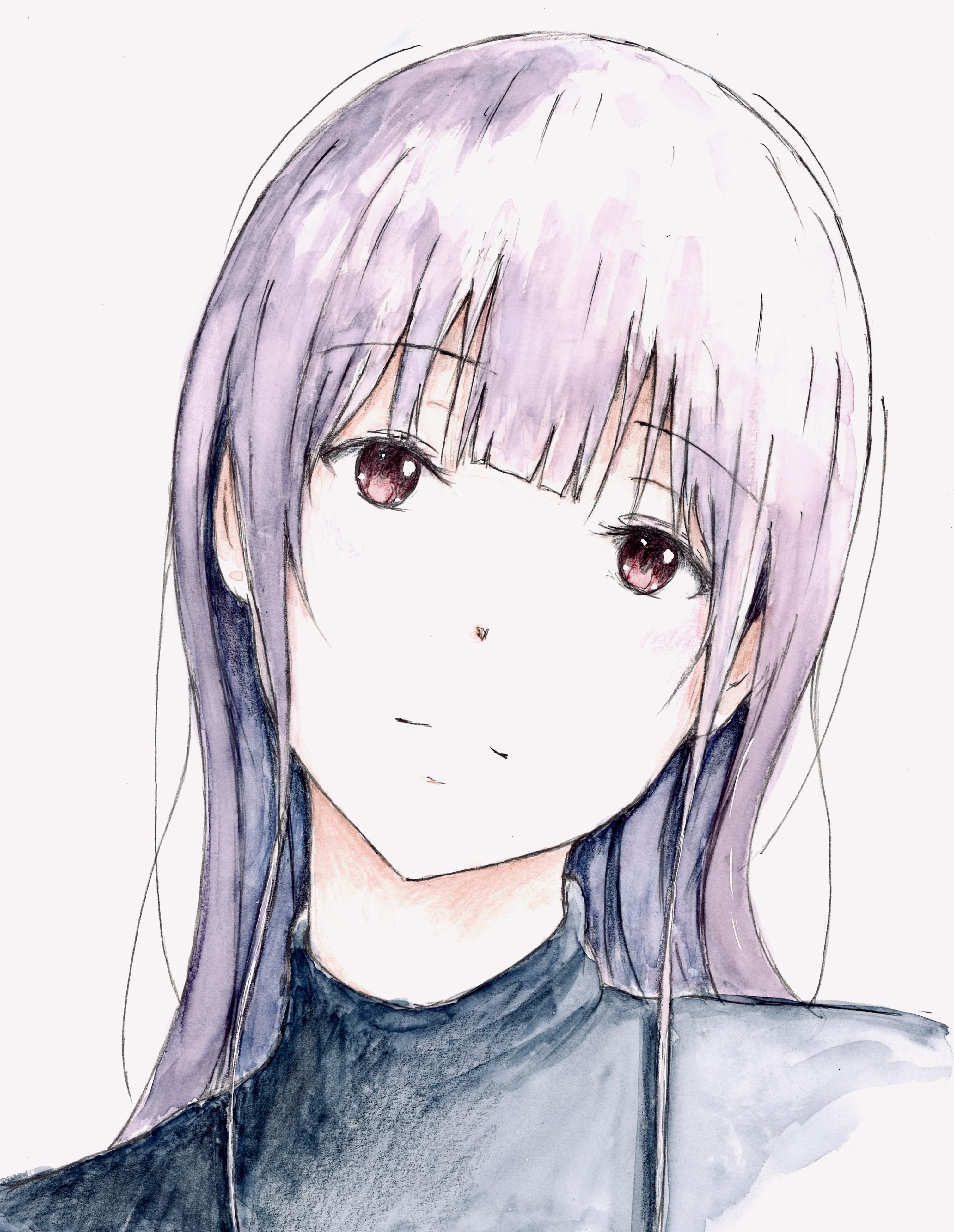 1girl absurdres bbmasa blunt_bangs closed_mouth commentary_request gradient_background grey_background hibike!_euphonium highres liz_to_aoi_tori long_hair looking_at_viewer portrait purple_hair red_eyes solo traditional_media yoroizuka_mizore