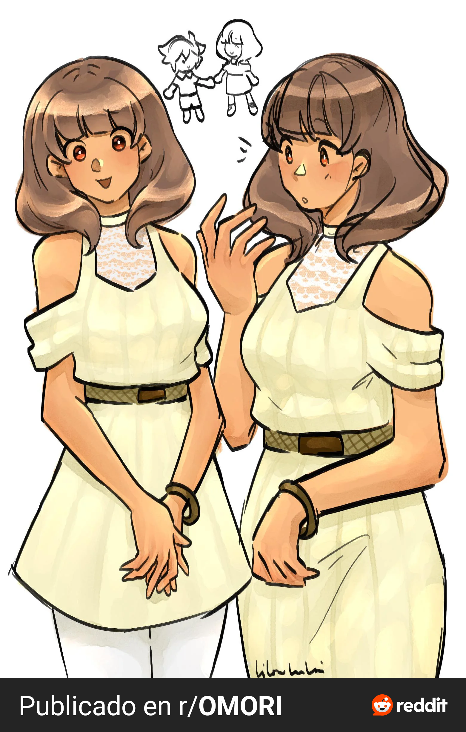 1girl absurdres artist_request basil_(faraway)_(omori) basil_(omori) blush brown_eyes brown_hair dark-skinned_female dark_skin dress highres lilowleelani omori pantyhose polly_(omori) smile