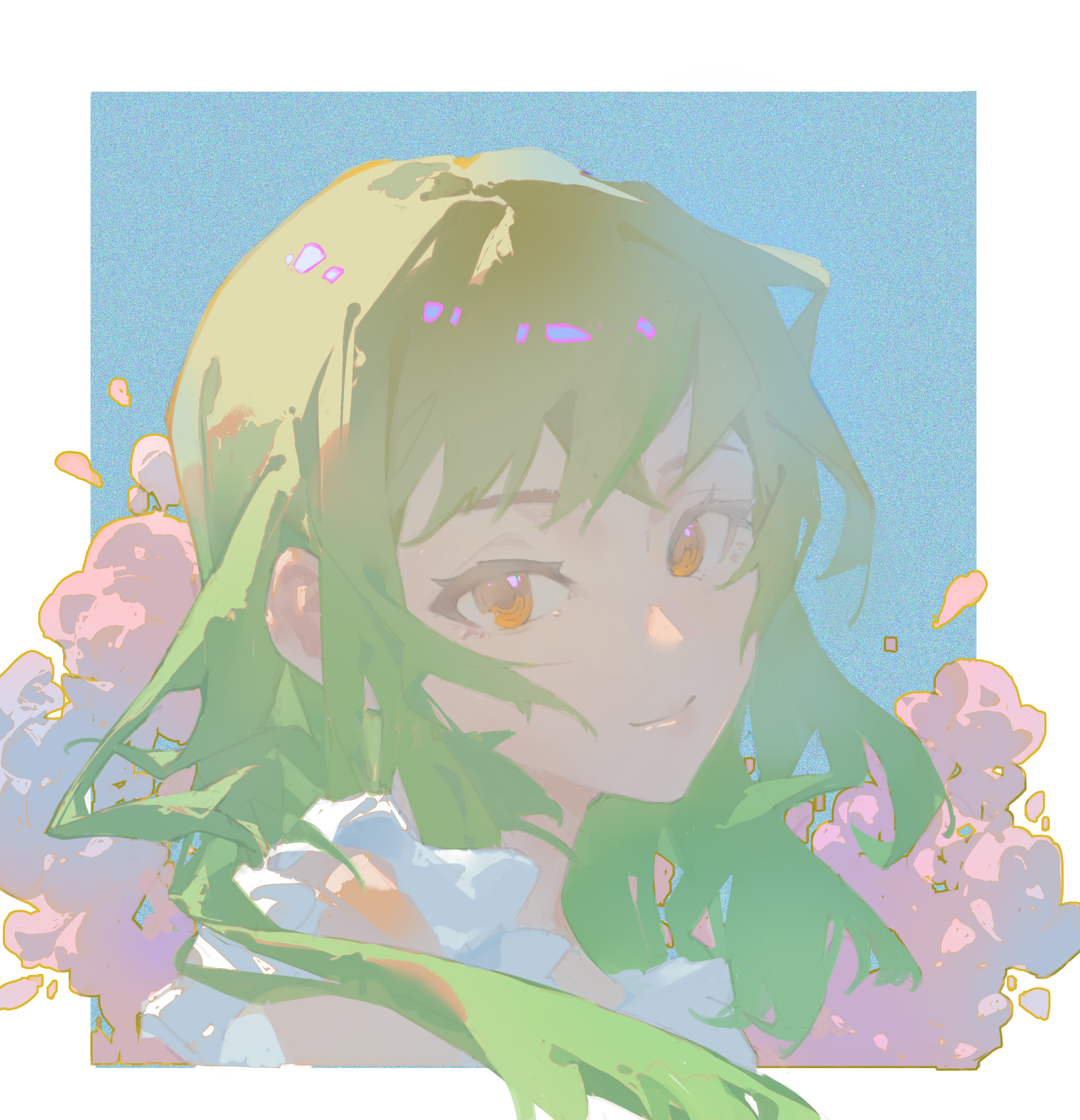 1girl absurdres blue_background border chinese_commentary closed_mouth commentary_request eyelashes film_grain flower frilled_shirt frills green_hair hair_over_shoulder highres long_hair looking_at_viewer miren_de_du_nan orange_eyes original outside_border pink_flower portrait shirt sidelocks sleeveless sleeveless_shirt smile turning_head white_border white_shirt wispy_bangs