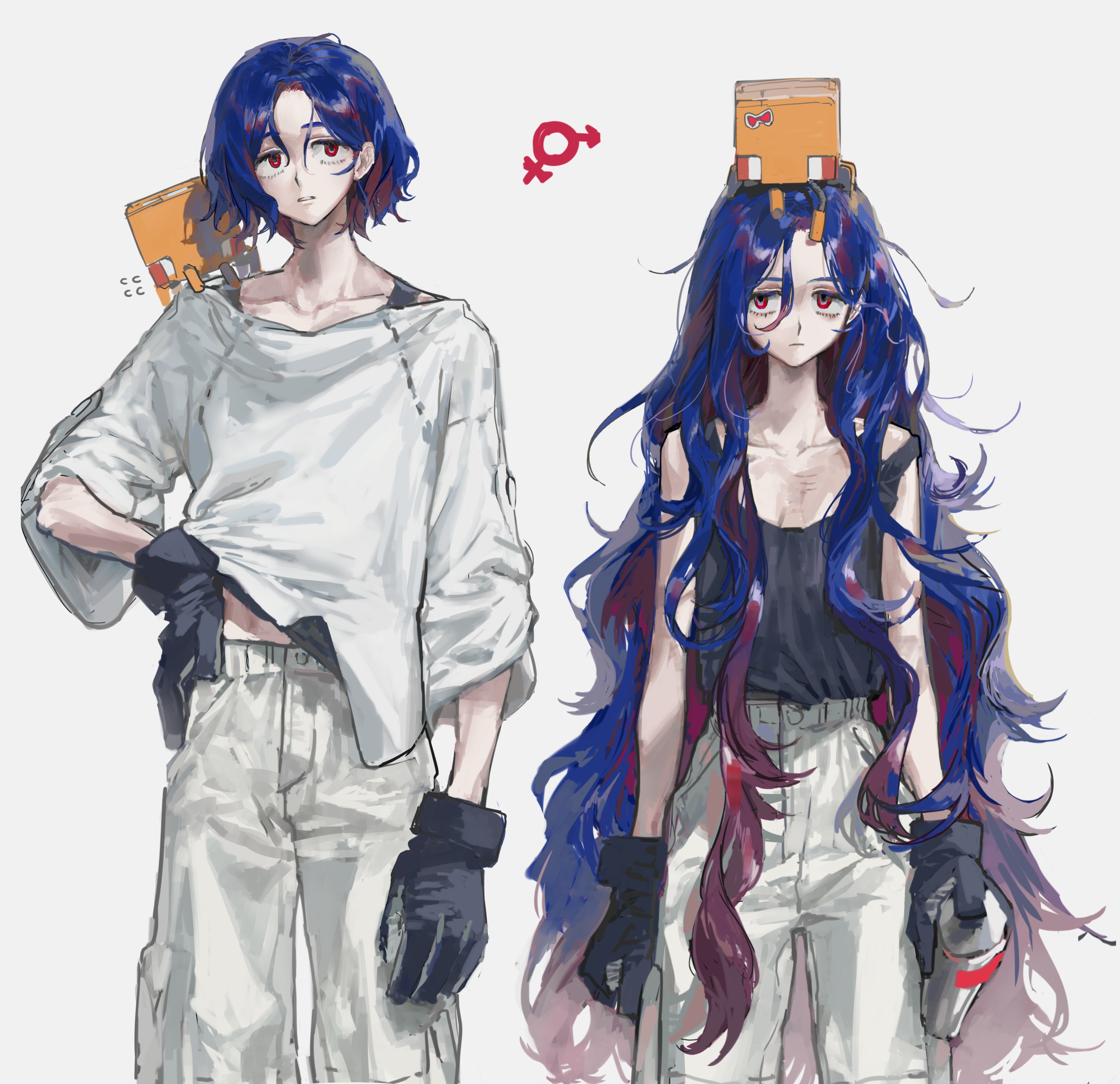 1boy 1girl absurdres black_gloves black_tank_top blue_hair breasts closed_mouth commentary conch_(gundam) diurtion flying_sweatdrops genderswap genderswap_(mtf) gloves grey_background gundam gundam_gquuuuuux hair_between_eyes highres holding long_hair male-female_symbol multicolored_hair pants purple_hair red_eyes red_hair shirt shuji_ito simple_background spray_can untranslatable_commentary tank_top very_long_hair white_pants white_shirt