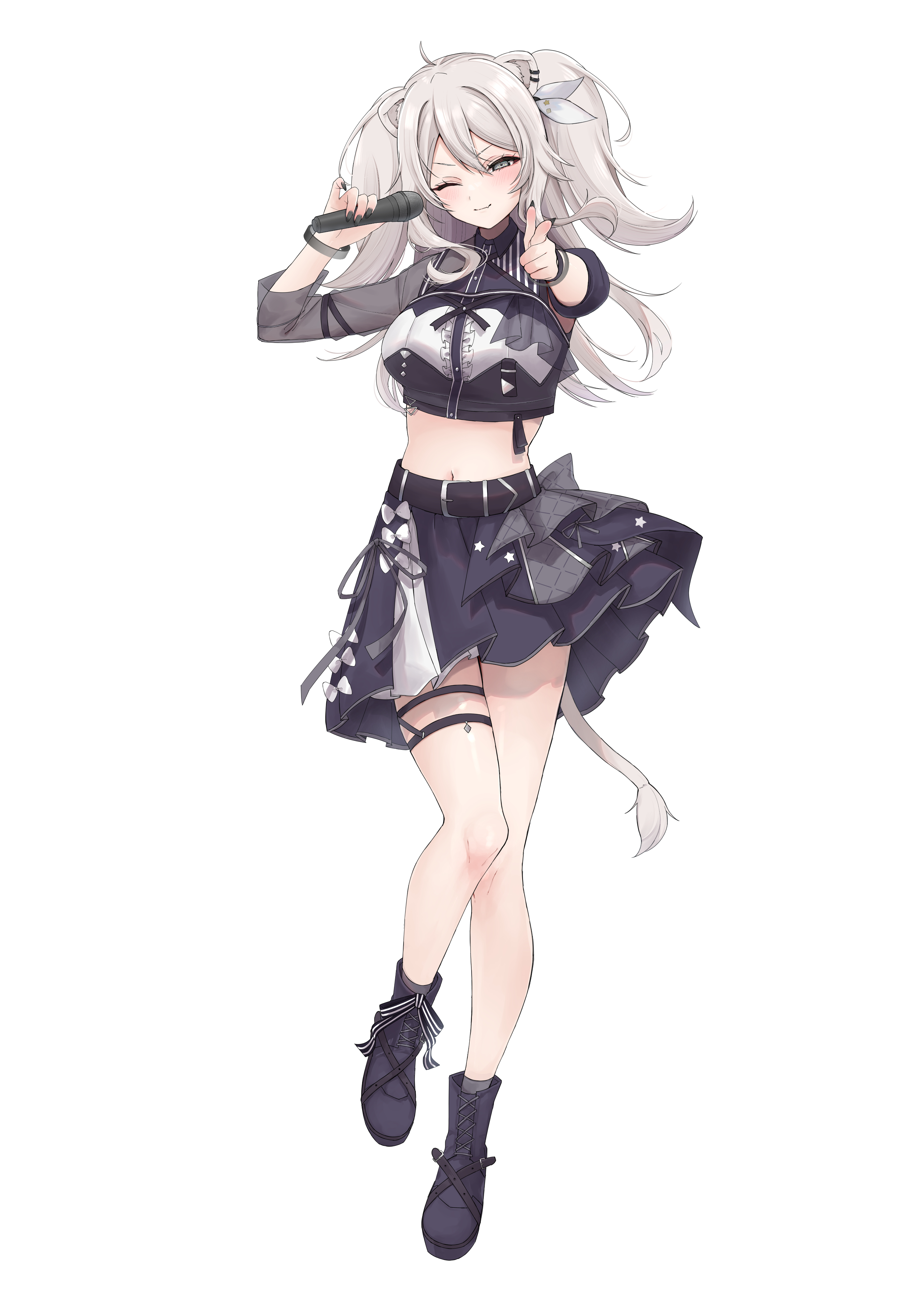 1girl absurdres ahoge alternate_costume animal_ear_piercing animal_ears asymmetrical_sleeves black_boots black_eyes black_nails black_shirt black_skirt blush boots bracelet breasts closed_mouth commentary crop_top cropped_shirt double-parted_bangs finger_gun framed_breasts full_body grey_hair hair_ribbon highres holding holding_microphone hololive jewelry lace-up_boots layered_skirt lion_ears lion_girl lion_tail long_hair looking_at_viewer medium_breasts microphone midriff miniskirt mismatched_sleeves nail_polish navel nerorigogo one_eye_closed pleated_skirt pointing pointing_at_viewer ribbon see-through_clothes see-through_sleeves shirt shishiro_botan simple_background skirt smile solo standing untranslatable_commentary tail thigh_strap two_side_up virtual_youtuber white_background white_ribbon