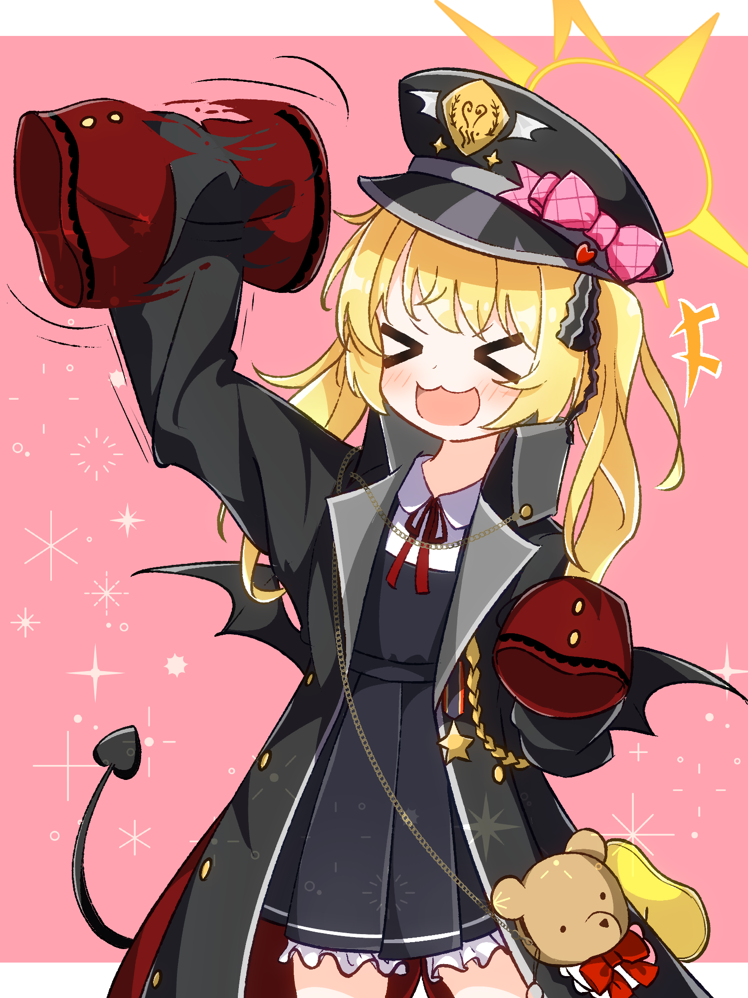 >_< 1girl afterimage black_horns black_tail black_wings blonde_hair blue_archive boots bow demon_girl demon_horns demon_tail demon_wings dress halo hat highres horns ibuki_(blue_archive) lee0fld long_hair long_sleeves low_wings notice_lines open_mouth peaked_cap pinafore_dress pink_bow ribbon side_ponytail sleeveless sleeveless_dress sleeves_past_fingers sleeves_past_wrists smile solo stuffed_animal stuffed_toy tail teddy_bear waving wings yellow_boots yellow_halo