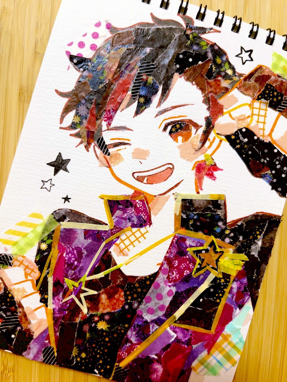 1boy ;) arm_up black_gloves black_jacket black_shirt brown_hair clenched_hands commentary ensemble_stars! fingerless_gloves gloves highres jacket male_focus masking_tape_(medium) mixed_media nagumo_tetora one_eye_closed pamutaro photo_(medium) red_eyes shirt short_hair smile solo star_(symbol) untranslatable_commentary t-shirt traditional_media unconventional_media upper_body very_short_hair
