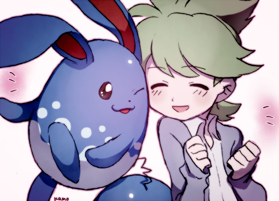 1boy :3 azumarill clenched_hands closed_eyes collared_shirt commentary_request gen_2_pokemon green_hair grey_jacket jacket long_sleeves mari_mokomo nintendo notice_lines one_eye_closed open_clothes open_jacket open_mouth pokemon pokemon_(creature) pokemon_omega_ruby_and_alpha_sapphire shirt short_hair signature smile upper_body wally_(pokemon) white_shirt