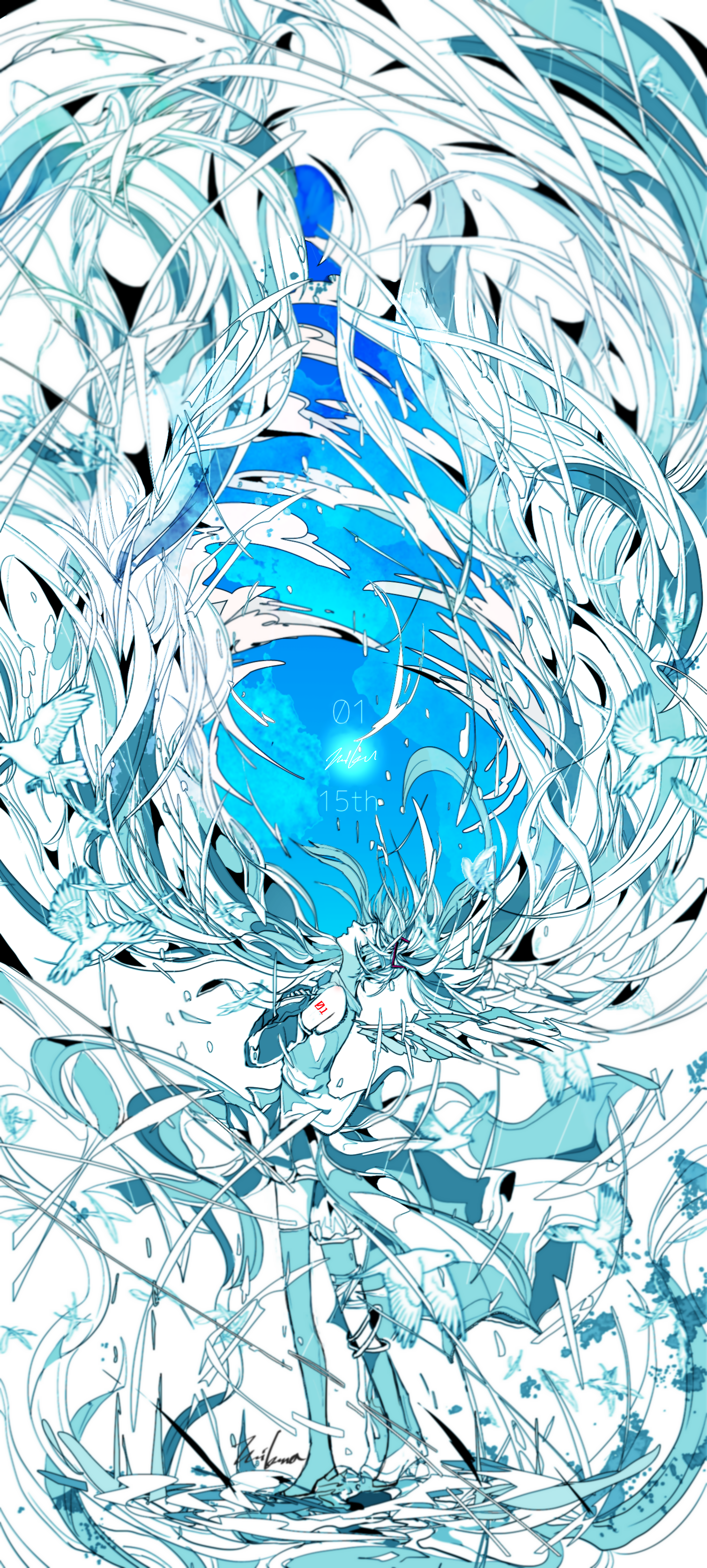 1girl 3kuma absurdly_long_hair absurdres bird bird_request blue_background blue_theme blurry closed_eyes colored_skin commentary_request cursive dated depth_of_field detached_sleeves facing_up from_side hatsune_miku highres long_hair open_mouth own_hands_together signature skirt sleeveless solo standing very_long_hair vocaloid white_skin