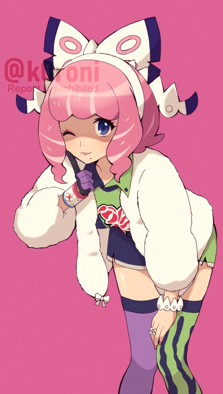 1girl artist_name asymmetrical_legwear bow bracelet breasts collared_shirt drill_hair dynamax_band eyeshadow flipped_hair fur_jacket hair_bow hairband hand_on_own_knee hand_up jacket jewelry klara_(pokemon) knees_together_feet_apart koroni_(nkrgs) leaning_forward makeup medium_breasts mole mole_under_mouth multicolored_thighhighs nintendo pink_background pink_eyeshadow pink_hair pink_lips pokemon pokemon_sword_and_shield print_shirt print_shorts purple_eyes ring shaded_face shirt short_hair shorts side_slit side_slit_shorts solo twin_drills two-tone_shirt two-tone_shorts two-tone_thighhighs white_bow white_hairband