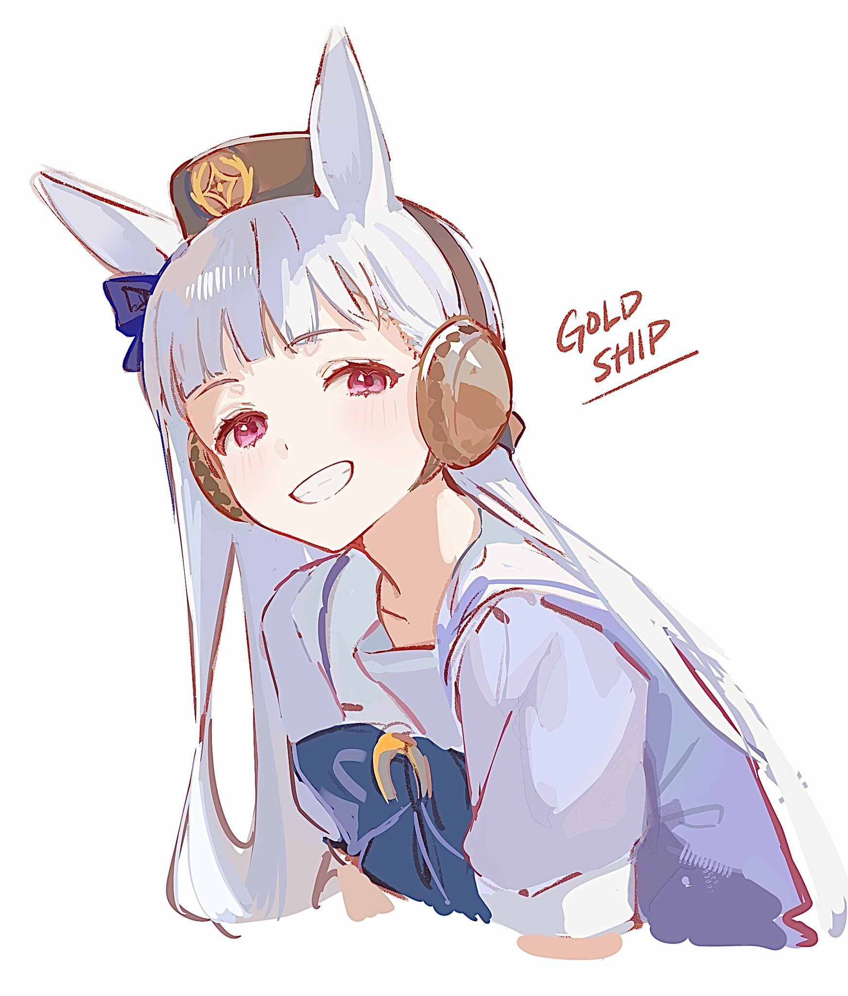 1girl animal_ears blunt_bangs bow brown_hat character_name cropped_torso ear_bow ear_covers ear_ornament ear_ribbon gold_ship_(umamusume) grin hat highres horse_ears horse_girl horseshoe_ornament long_hair pillbox_hat pink_eyes purple_bow sailor_collar sailor_shirt school_uniform shirt smile solo soybean_(hisoybean) tracen_school_uniform umamusume white_background white_hair