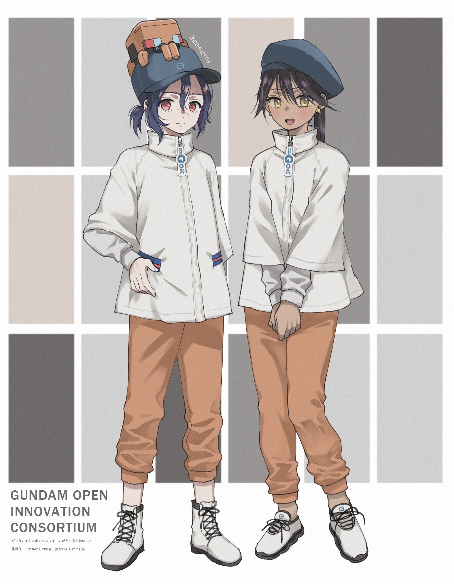 1boy 1girl artist_name beret blue_hair blush commentary_request conch_(gundam) full_body gundam gundam_gquuuuuux hat highres jacket long_hair looking_at_viewer lower_eyelashes_only momoshny multicolored_hair non-humanoid_robot nyaan_(gundam_gquuuuuux) open_mouth pants purple_hair red_eyes robot shoes short_hair shuji_ito smile twitter_username two-tone_hair yellow_eyes