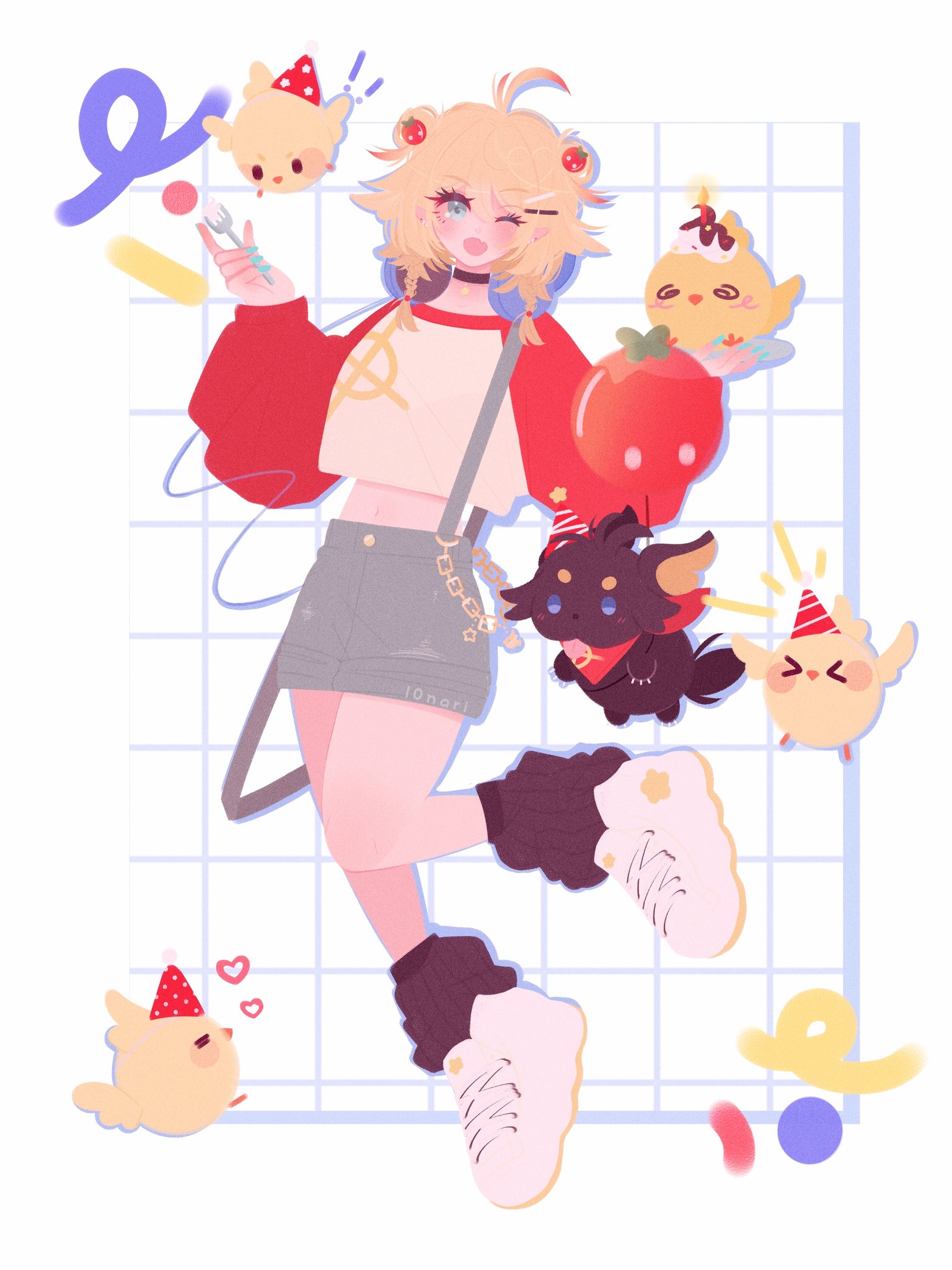 1girl ahoge alternate_costume bird birthday birthday_cake black_choker black_socks blonde_hair blush braid cake chain choker doki_amber_doge_(dokibird) dokibird dokibird_(tomato) fang feather_hair food fork full_body gold_chain green_eyes grid_background hair_between_eyes hair_ornament highres holding holding_fork indie_virtual_youtuber l0nari long_sleeves looking_at_viewer midriff navel one_eye_closed open_mouth pointy_ears shoes skin_fang skirt smile sneakers socks suspender_skirt suspenders twin_braids virtual_youtuber yellow_bird