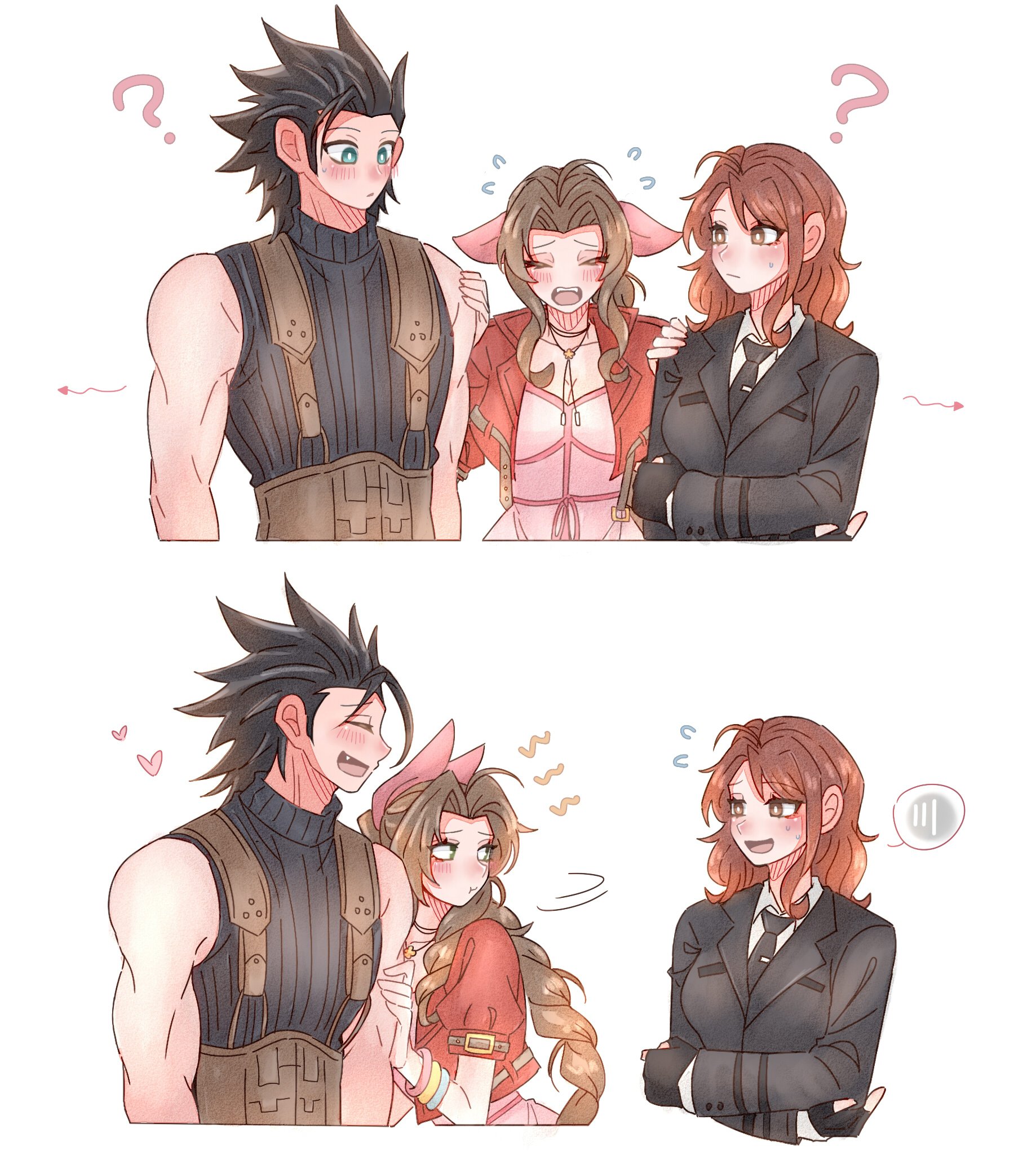 1boy 2girls 7_(milu577610) ? aerith_gainsborough arrow_(symbol) bare_shoulders black_gloves black_hair black_jacket black_necktie blue_eyes blush braid braided_ponytail brown_eyes brown_hair cissnei collared_shirt crossed_arms dress final_fantasy final_fantasy_vii final_fantasy_vii:_ever_crisis final_fantasy_vii_rebirth final_fantasy_vii_remake fingerless_gloves flying_sweatdrops gloves green_eyes hair_ribbon hand_on_another's_shoulder heart highres jacket jealous leaning_on_person long_hair looking_at_another motion_lines multiple_girls necktie open_clothes open_jacket open_mouth parted_bangs pink_dress pink_ribbon ponytail red_jacket ribbed_sweater ribbon shirt simple_background single_sidelock sleeveless sleeveless_turtleneck spiked_hair suspenders sweatdrop sweater turtleneck turtleneck_sweater upper_body white_background white_shirt zack_fair