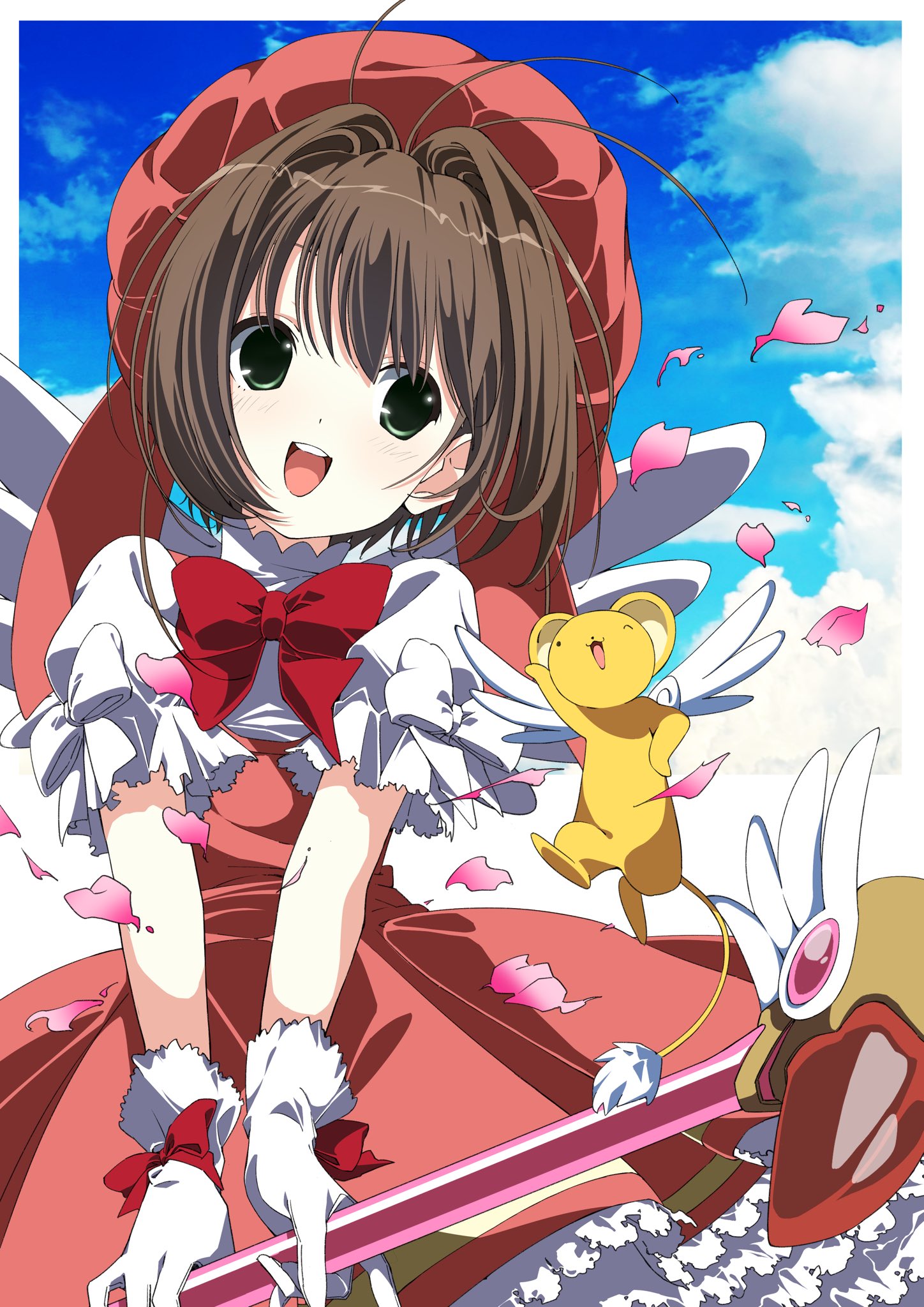 1girl 2000s_(style) blue_sky border bow bowtie brown_hair cardcaptor_sakura child cloud collared_shirt dress faux_retro_artstyle fuuin_no_tsue gloves green_eyes hair_intakes hat highres holding holding_wand insomnia_(insomnia_plus) kero_(cardcaptor_sakura) kinomoto_sakura kinomoto_sakura_(magician) looking_to_the_side magical_girl mini_wings open_mouth petals petticoat puffy_short_sleeves puffy_sleeves red_bow red_bowtie red_dress red_hat shirt short_hair short_sleeves sky smile wand white_border white_gloves white_shirt wings