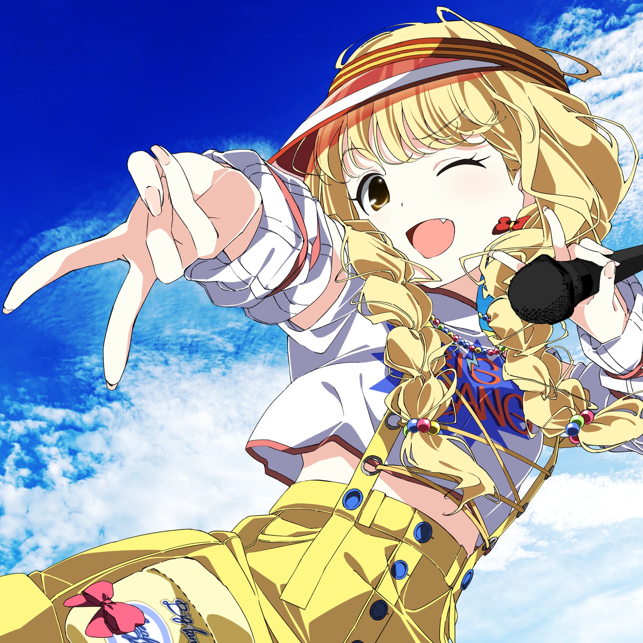 1girl blonde_hair blue_sky braid cloud cropped_shirt day detached_sleeves double_v fang fingernails fujita_kotone gakuen_idolmaster hair_bobbles hair_ornament hair_ribbon high-waist_shorts highres idolmaster insomnia_(insomnia_plus) jewelry long_hair microphone midriff_peek necklace one_eye_closed open_mouth outstretched_arm ribbon shirt short_sleeves shorts sky smile solo suspenders twin_braids v visor_cap white_shirt yellow_big_bang!_(idolmaster) yellow_eyes yellow_shorts