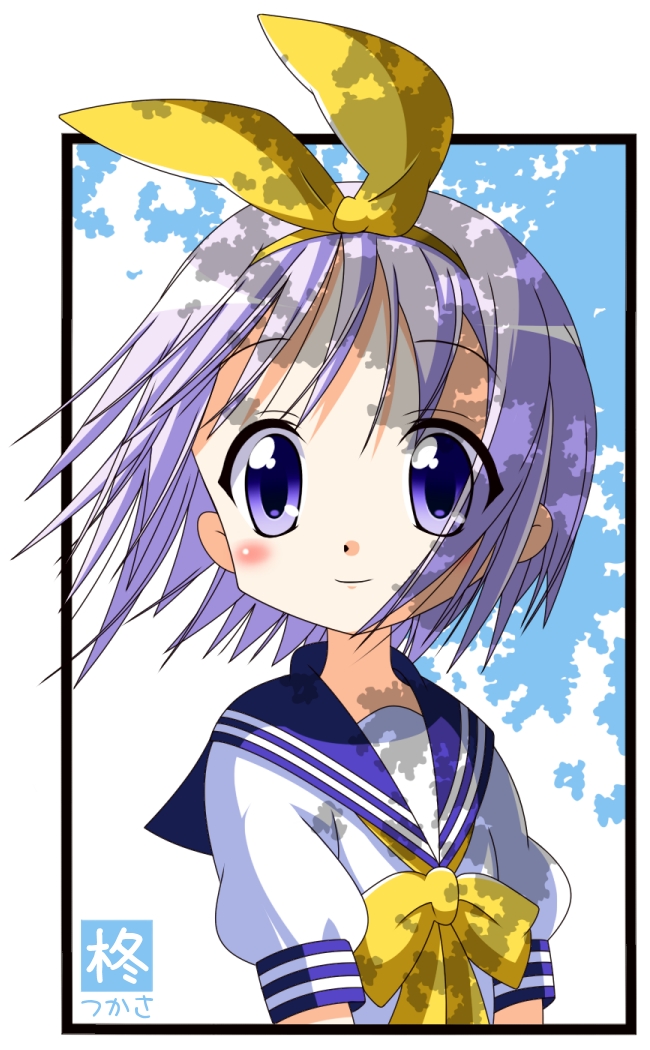 00s 1girl blue_eyes female_focus hair_ribbon hiiragi_tsukasa lucky_star purple_hair ribbon rindou_(awoshakushi) school_uniform serafuku short_hair solo