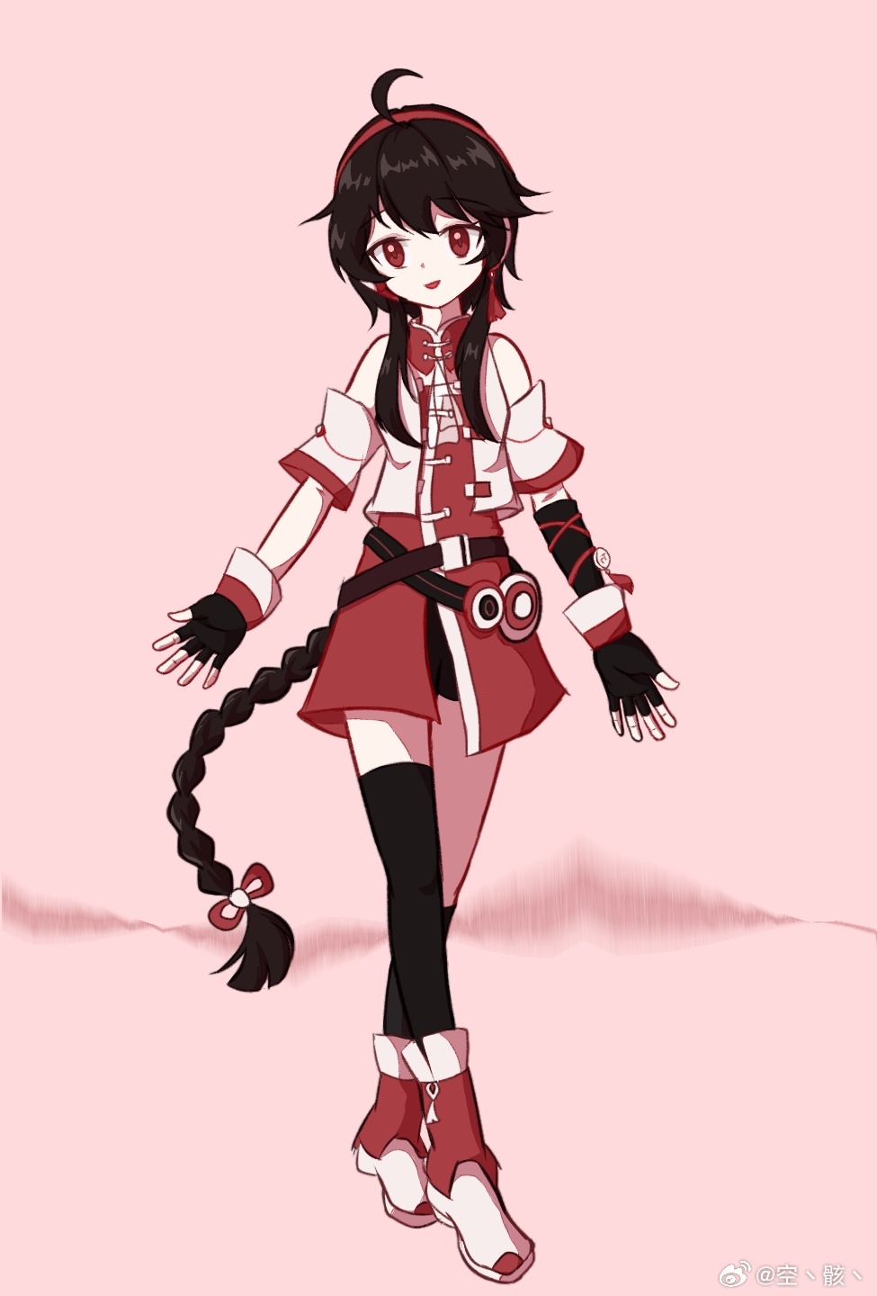 asymmetrical_legwear bare_shoulders belt black_gloves black_hair black_socks black_thighhighs boots braid brown_belt brown_hair dress fingerless_gloves full_body gloves headphones headset highres long_hair mole multicolored_boots open_clothes open_vest pink_background pointzhu red_boots red_dress red_eyes red_headset single_braid socks solo standing thighhighs very_long_hair vest vocaloid vsinger_(vocaloid) warm_colored watermark weibo_username weibo_watermark white_vest yuezheng_ling yuezheng_ling_(vocaloid3)