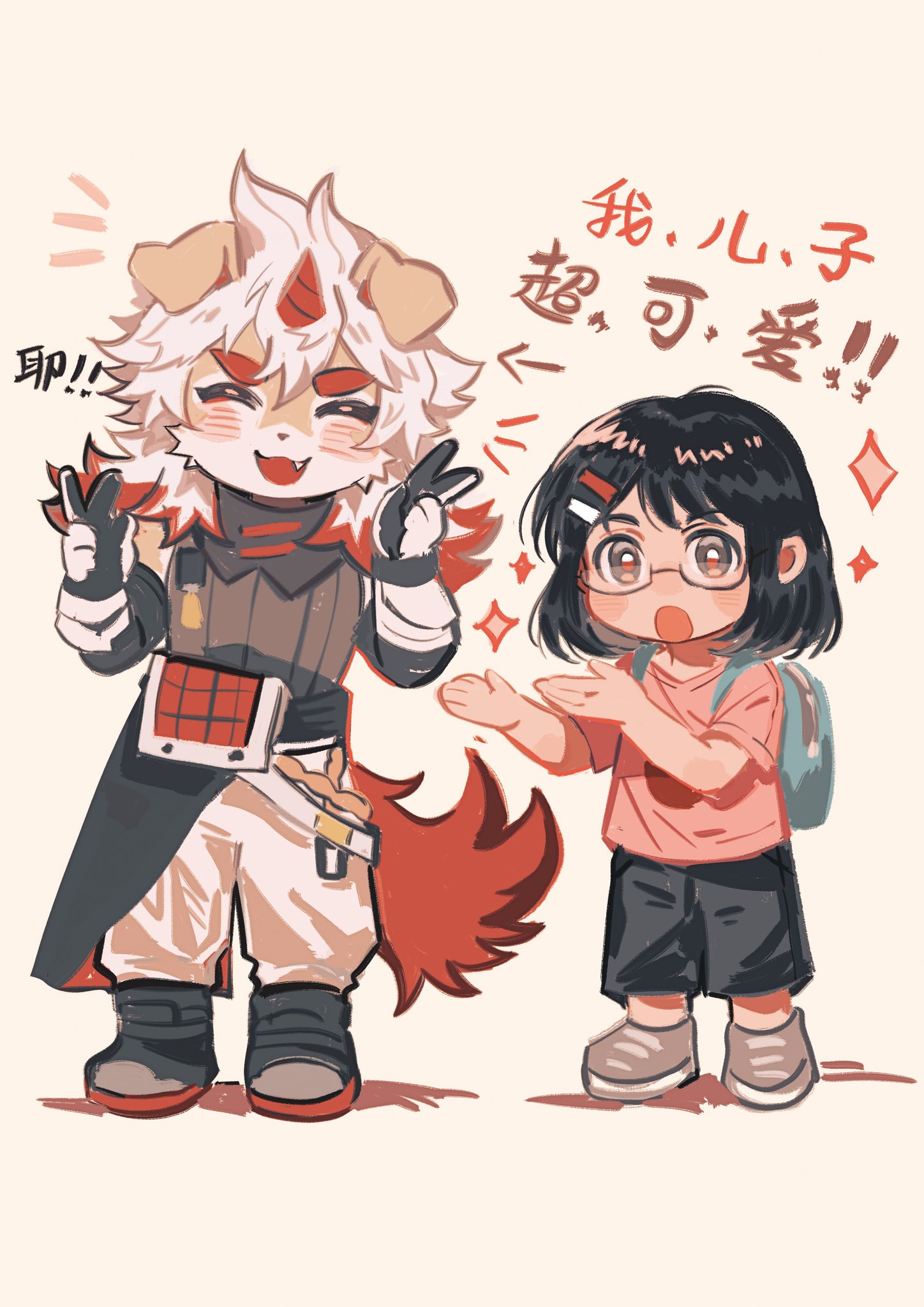 1boy 1girl arknights artist_self-insert blush chibi chibi_only chinese_commentary chinese_text colored_tips commentary double_v facing_viewer fang furry furry_male glasses highres horns hung_(arknights) komainu_boy komainu_ears komainu_tail looking_at_viewer multicolored_hair open_mouth original s3zwrtdyqaewnci single_horn sparkle translated v white_background