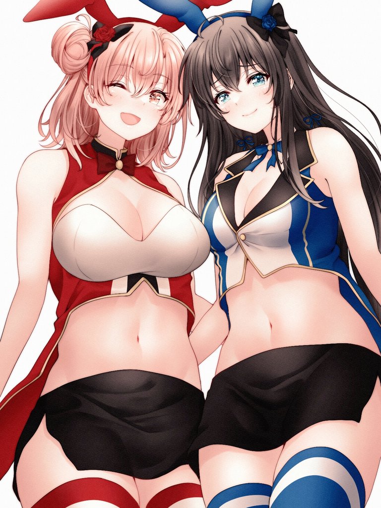 animal_ears bare_shoulders black_hair black_skirt blue_eyes blue_thighhighs blush breasts cleavage_cutout closed_mouth clothing_cutout collarbone commentary_request fake_animal_ears hair_bun long_hair looking_at_viewer medium_breasts medium_hair midriff miniskirt navel official_alternate_costume one_eye_closed open_mouth orange_hair paid_reward_available pencil_skirt rabbit_ears red_hayao red_thighhighs side_slit simple_background single_hair_bun single_side_bun skirt smile thighhighs white_background yahari_ore_no_seishun_lovecome_wa_machigatteiru. yellow_eyes yuigahama_yui yukinoshita_yukino