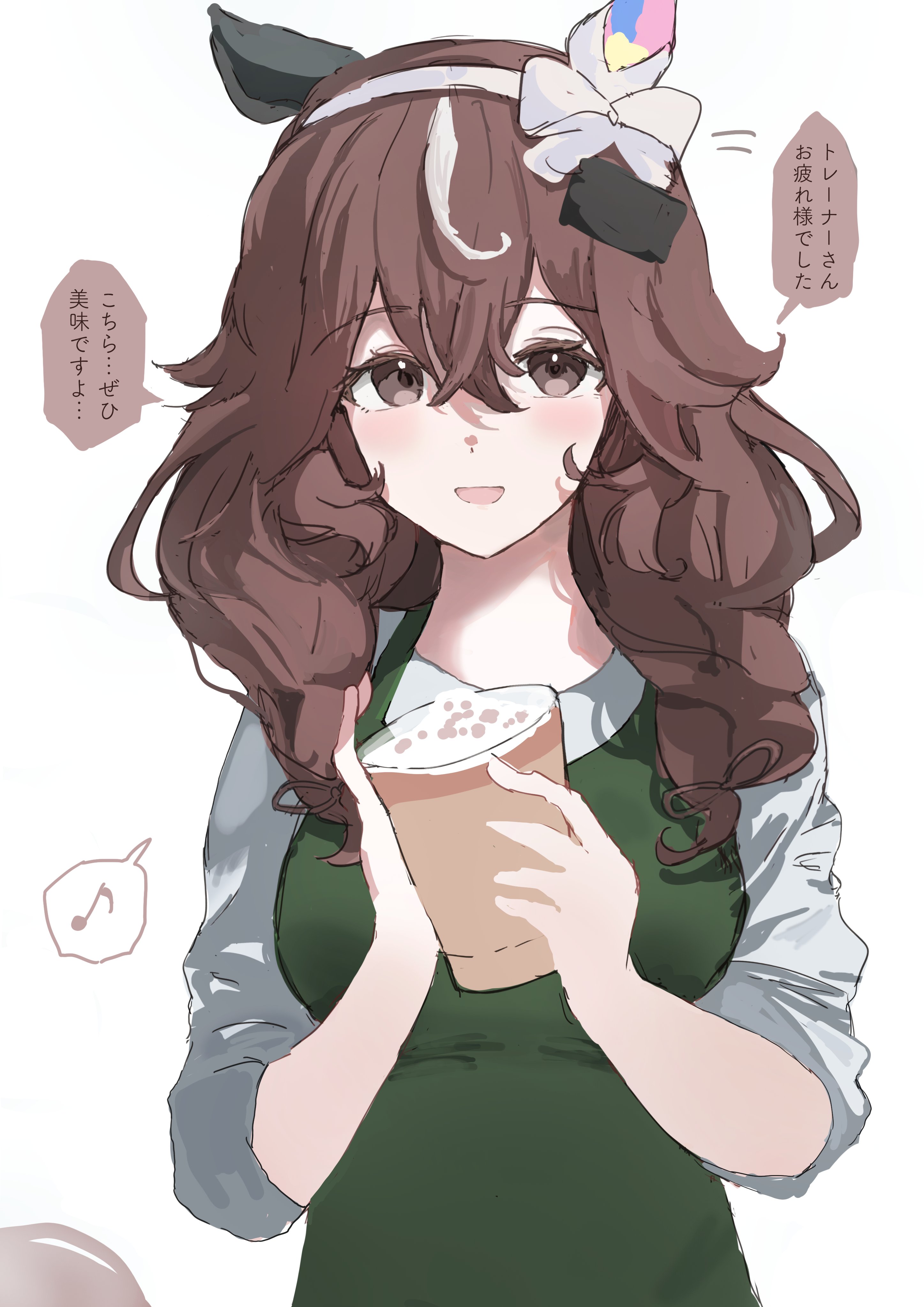 1girl absurdres alternate_costume apron braid breasts brown_eyes brown_hair commentary_request cup curren_bouquetd'or_(umamusume) grey_eyes hair_between_eyes hair_ornament hairband highres holding horse_girl low_twin_braids medium_breasts musical_note open_mouth solo spoken_musical_note takinii translation_request twin_braids umamusume white_background