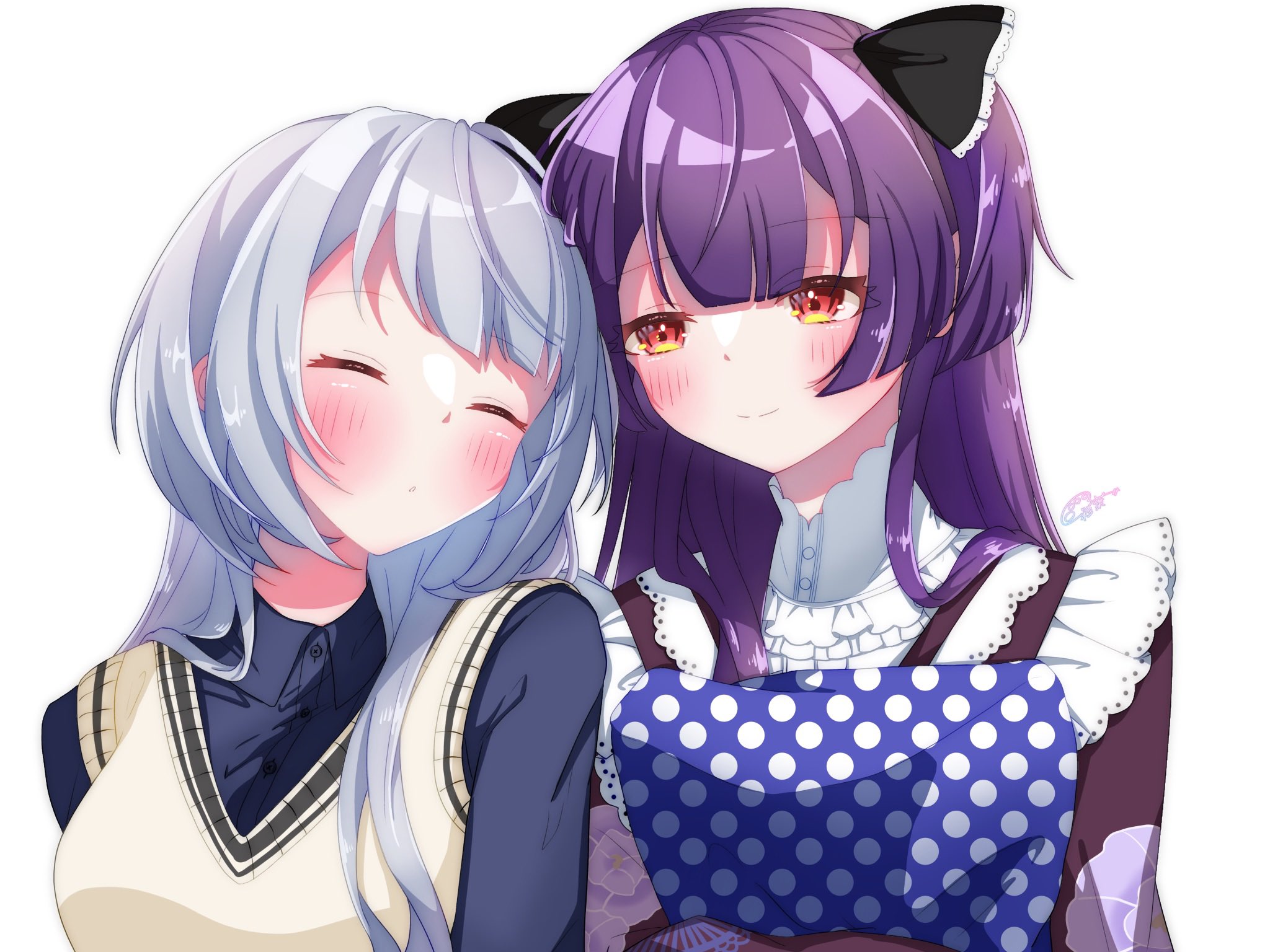 2girls apron black_bow black_ribbon blunt_bangs blush bow closed_eyes dress highres iroha_wds long_hair multiple_girls nekoashi_tsubomi polka_dot polka_dot_background polka_dot_dress purple_hair red_eyes ribbon senju_iroha shirt sleeping smile striped_background striped_clothes striped_shirt two_side_up upper_body world_dai_star