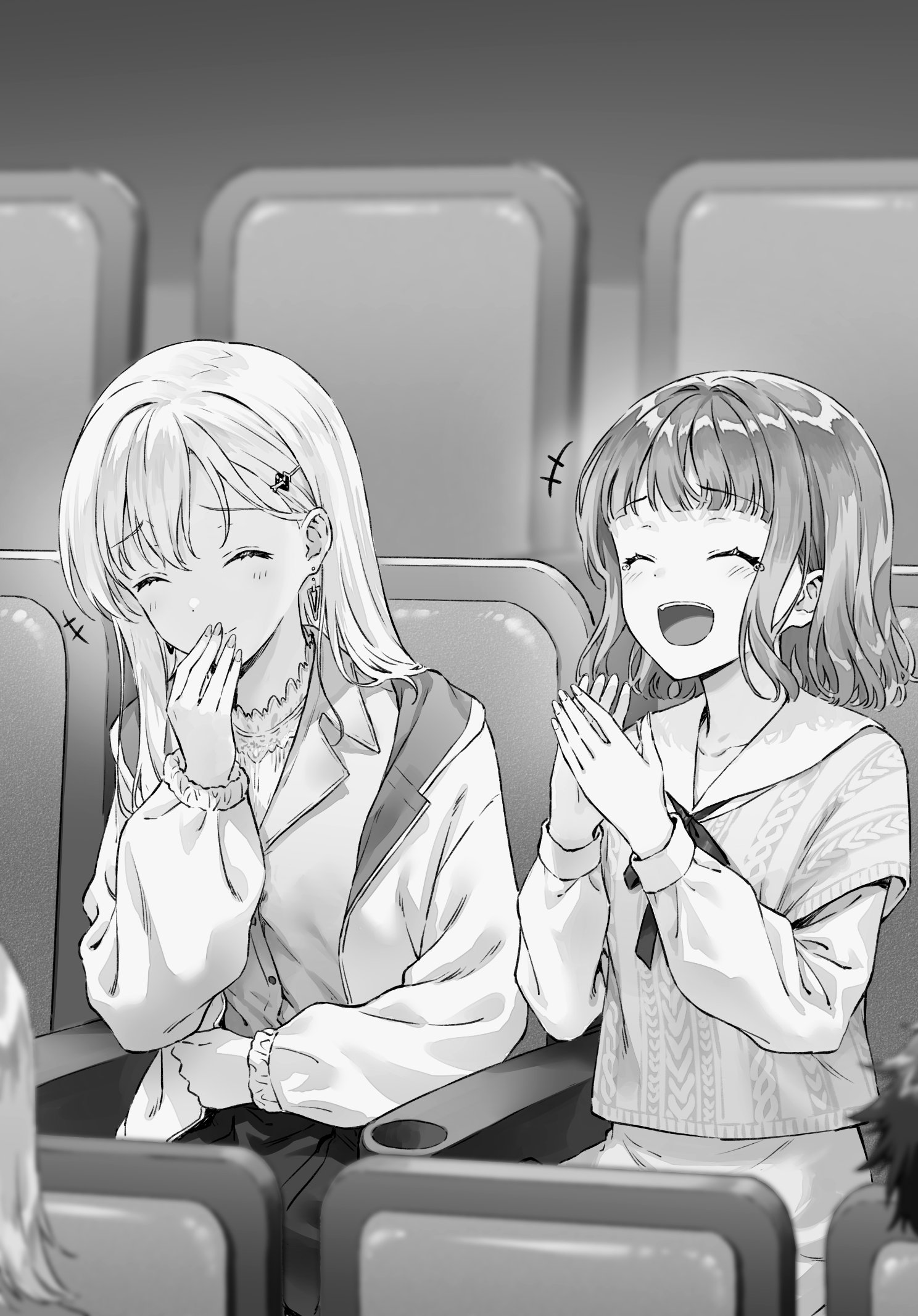 +++ 2girls ayase_saki closed_eyes collarbone collared_shirt commentary_request earrings gimai_seikatsu greyscale hair_ornament hairclip hand_to_own_mouth highres hiten_(hitenkei) jacket jewelry laughing medium_hair monochrome multiple_girls narasaka_maaya neck_ribbon novel_illustration official_art open_clothes open_jacket open_mouth ribbon second-party_source shirt theater_seating