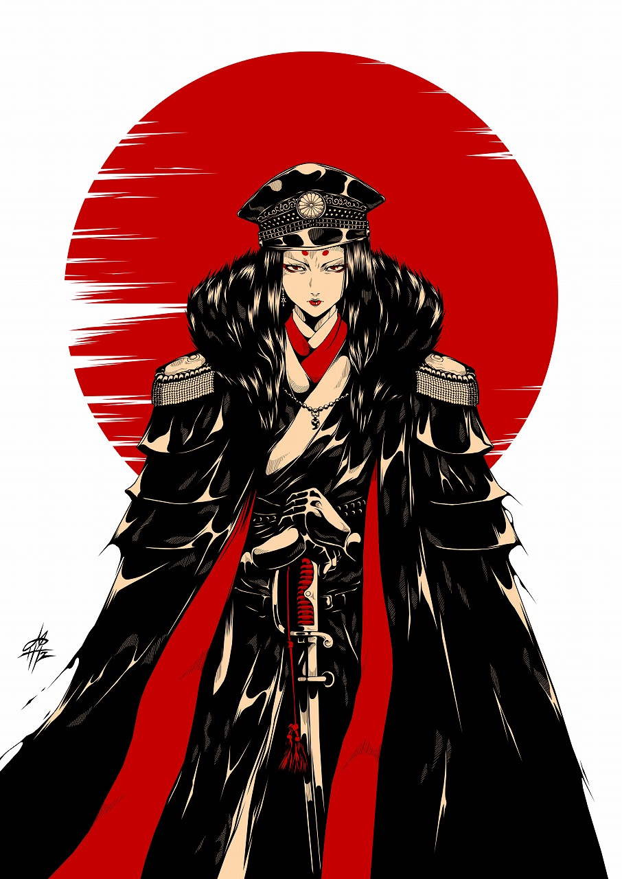 1girl coat commentary_request gloves grimace hat highres katana limited_palette long_hair looking_at_viewer military_uniform original peaked_cap short_eyebrows solo sword weapon yamada_satoshi
