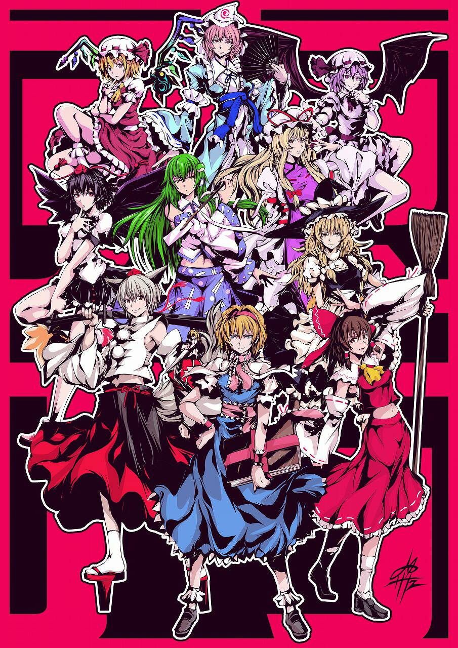 6+girls alice_margatroid black_hair blonde_hair detached_sleeves dress flandre_scarlet full_body green_hair grey_hair hakurei_reimu hat highres inubashiri_momiji japanese_clothes kirisame_marisa kochiya_sanae long_hair miko mob_cap multiple_girls purple_hair remilia_scarlet saigyouji_yuyuko second-party_source shameimaru_aya short_hair skirt tokin_hat touhou wings yakumo_yukari yamada_satoshi