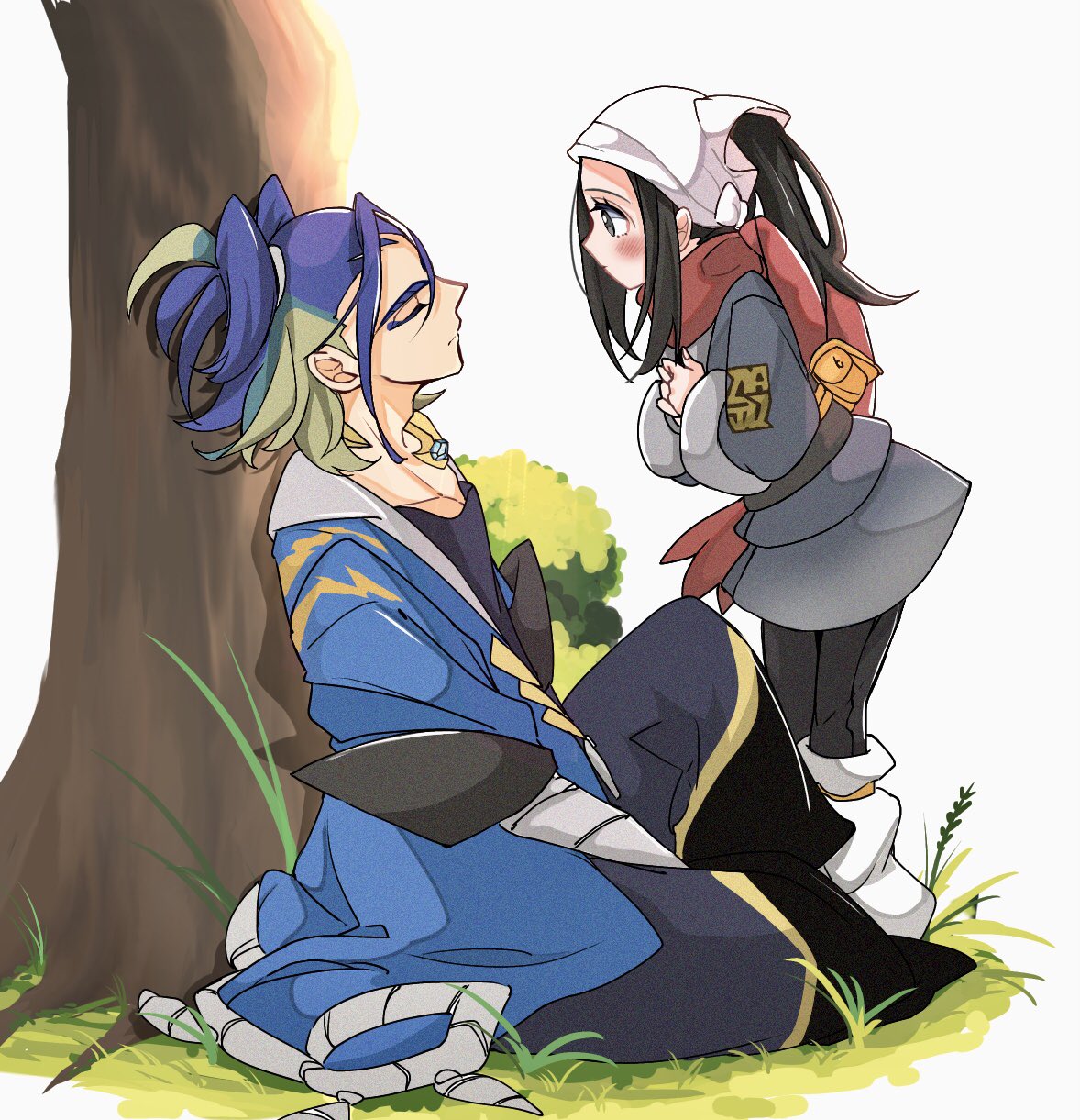 1boy 1girl adaman_(pokemon) against_tree akari_(pokemon) black_hair black_sash blonde_hair blue_coat blue_hair blush closed_eyes closed_mouth coat cocoa_s3 collarbone diamond_clan_outfit eyebrow_cut eyelashes galaxy_expedition_team_survey_corps_uniform green_hair grey_eyes grey_jacket hat headscarf highres jacket jewelry long_hair multicolored_hair nintendo outdoors pantyhose pokemon pokemon_legends:_arceus ponytail red_scarf sash scarf shirt sidelocks sitting tree white_headscarf