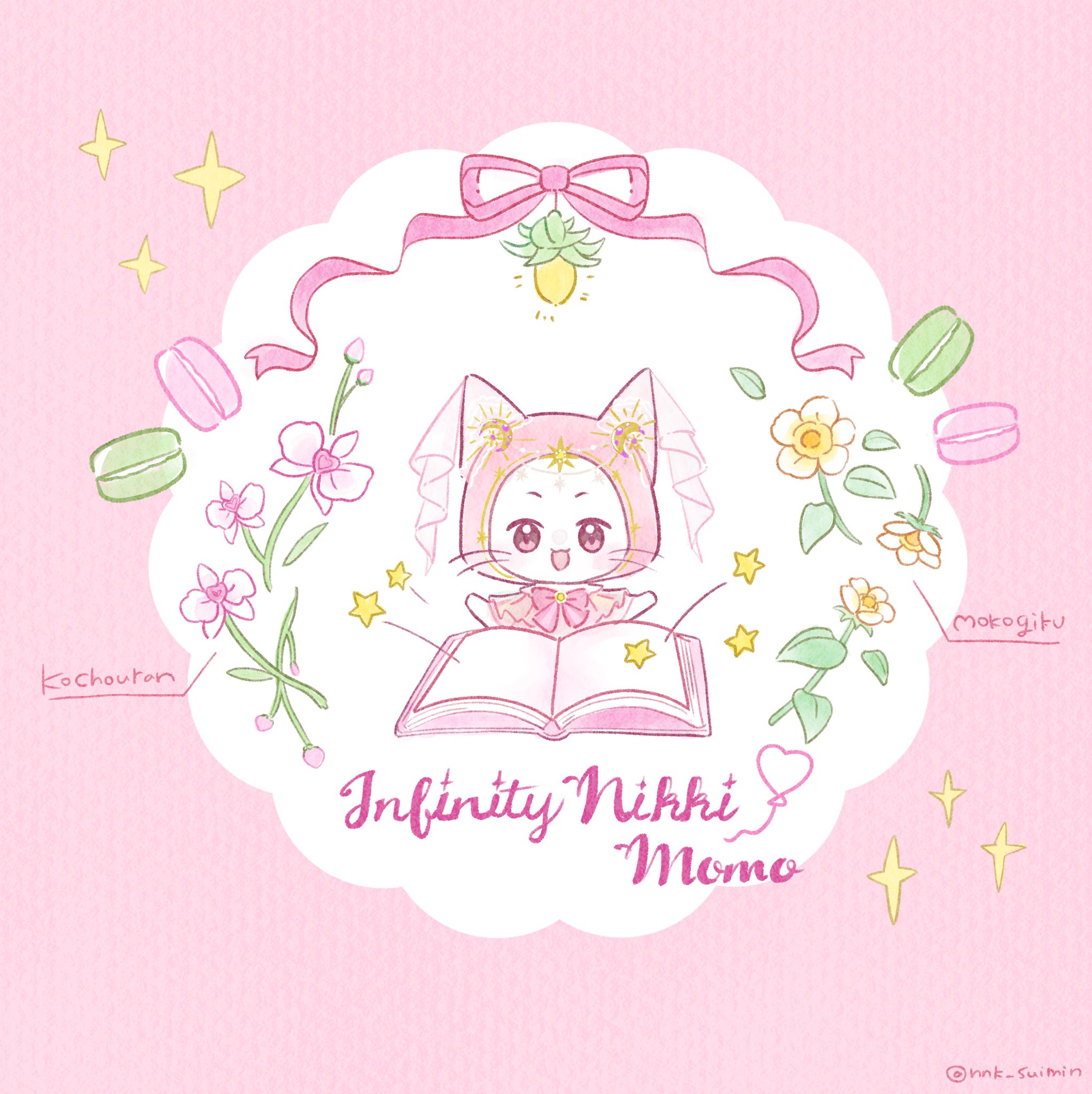 animal animal_focus book bow bowtie brooch brown_eyes cat character_name circle circlet cloak clothed_animal copyright_name denim denim_shorts ear_covers flower food frilled_cloak happy highres hood hood_up hooded_cloak infinity_nikki jewelry light_blush macaron momo_(nikki) neneko_(nnk_suimin) nikki_(series) no_humans official_alternate_costume open_book pink_background pink_bow pink_bowtie pink_cloak pink_theme shorts solo star_(symbol) straight-on twitter_username white_cat white_flower