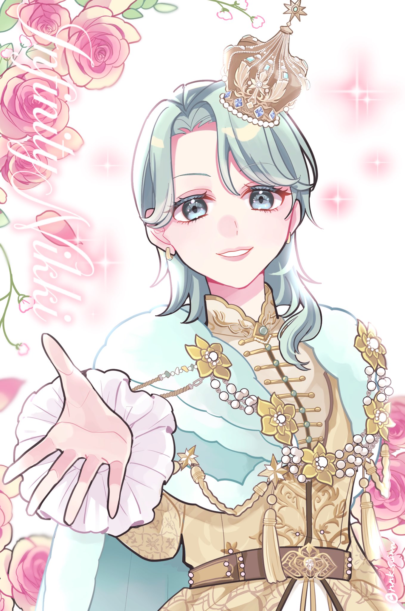 1girl androgynous bead_necklace beads belt belt_buckle brown_belt buckle cape chinese_clothes coat collared_shirt copyright_name cowboy_shot crown eyelashes floral_background flower flower_necklace frilled_sleeves frills fur-trimmed_cape fur_trim gold_crown grey_cape grey_eyes grey_hair happy highres infinity_nikki jewelry lipstick long_sleeves looking_at_viewer makeup mandarin_collar mini_crown necklace neneko_(nnk_suimin) nikki_(series) offering_hand open_mouth outstretched_hand pants parted_bangs pink_flower pink_lips pink_rose rose shirt smile solo sparkle standing tangzhuang teeth twilight_oath_(infinity_nikki) white_background white_pants white_shirt yellow_coat yellow_flower