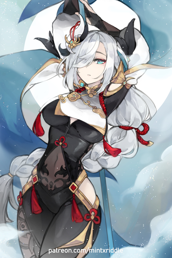 aqua_eyes arms_up black_bodysuit bodysuit braid single_breast_curtain breasts breasts_apart chinese_knot clothing_cutout cloud cowboy_shot detached_sleeves eyeliner genshin_impact glitter gloves hair_over_one_eye holding holding_polearm holding_weapon long_hair looking_at_viewer low-braided_long_hair low-tied_long_hair makeup mintxriddle partially_fingerless_gloves patreon_username polearm red_eyeliner see-through_clothes see-through_midriff shenhe_(genshin_impact) single_braid standing tassel thigh_cutout weapon