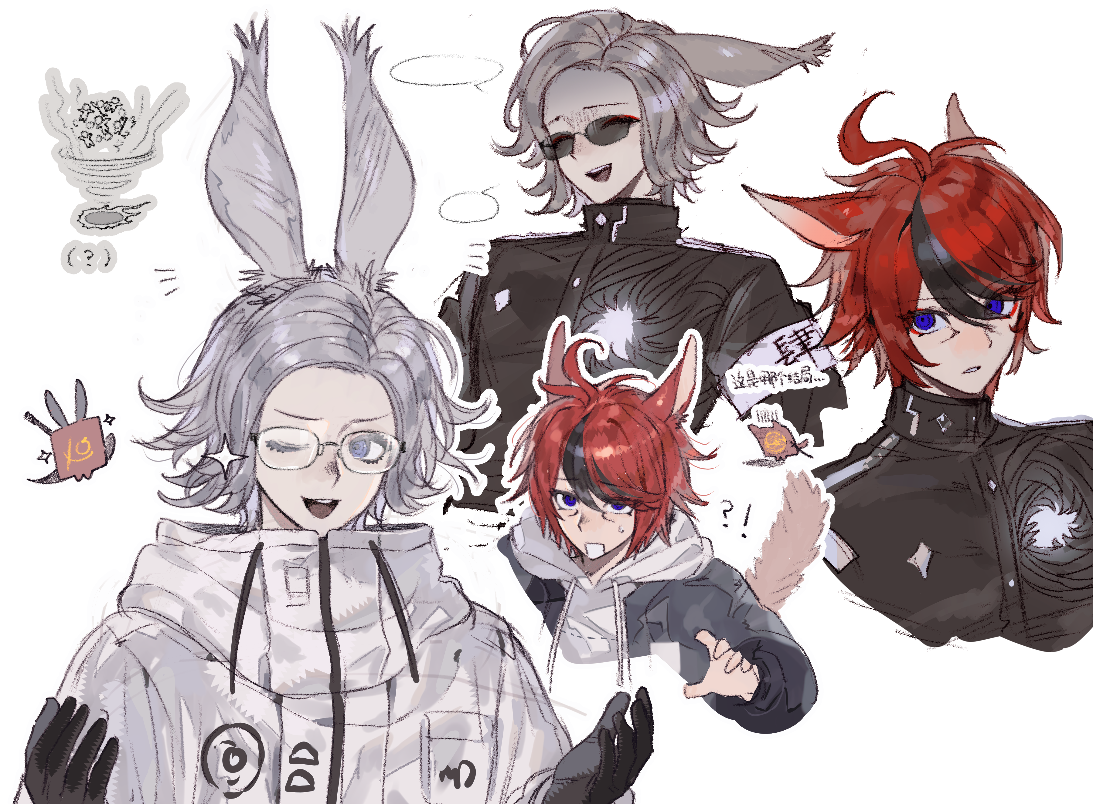 !? 2boys :d absurdres ahoge aotsuki_eito armband arms_up black_gloves black_streaks blank_speech_bubble blue_eyes cat_boy chinese_commentary closed_eyes cropped_torso drawstring eyeshadow final_fantasy final_fantasy_xiv gakuran glasses gloves grey_hair highres hole_in_chest hole_on_body hood hoodie jacket job_icon_(final_fantasy) last_defense_academy_school_uniform looking_at_viewer makeup male_focus miqo'te multicolored_hair multiple_boys multiple_views one_eye_closed open_mouth parted_lips rabbit_boy reaper_(final_fantasy) red_eyeshadow red_hair samurai_(final_fantasy) school_uniform scythe short_hair simple_background smile sparkle speech_bubble streaked_hair sumino_takumi sunglasses sweatdrop sword syuu_1125 tail the_hundred_line_-last_defense_academy- viera warrior_of_light_(ff14) weapon weapon_on_back white_armband white_background white_hoodie white_jacket