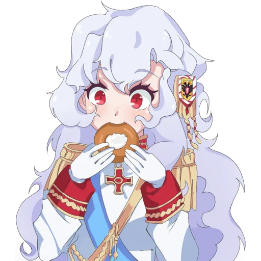 1girl aiguillette alpha_(alpha_1918) armband buttons collar cross cross_pendant donut eating epaulettes findoworld fluffy fluffy_hair food gloves gold_buttons gold_trim hair_ornament happy lips long_hair looking_at_viewer military military_uniform non-web_source original red_eyes russian_empire sleeve_cuffs solo sticker_(medium) transparent transparent_background very_long_hair white_gloves white_hair