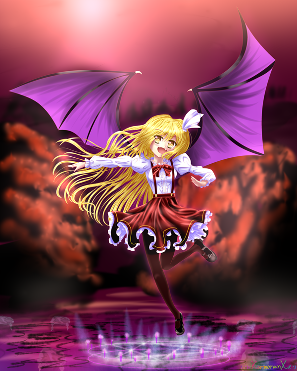 1girl bat_wings blonde_hair bow elis_(touhou) facial_mark flower flying hair_bow hair_flower hair_ornament hexagram korumoran long_hair long_sleeves open_mouth pantyhose pointy_ears red_bow red_skirt shirt skirt smile solo star_(symbol) vest white_shirt wings