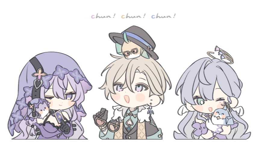 1boy 2girls animal animal_on_head aqua_eyes aqua_shirt aventurine_(honkai:_star_rail) aventurine_(origami_bird)_(honkai:_star_rail) bare_shoulders beak belt between_fingers bird bird_on_head black_belt black_collar black_gloves black_hat black_jacket black_swan_(honkai:_star_rail) black_vest blonde_hair blue_eyes blue_hair blush_stickers bracelet breasts buttons card closed_mouth clothing_cutout collar collared_shirt colored_inner_hair crossed_bangs detached_sleeves dress earrings feathered_wings flower_ornament fur-trimmed_jacket fur_trim gloves gold_bracelet grey_hair hair_between_eyes halo hand_up hat head_wings heart_cutout holding holding_card holding_removed_eyewear honkai:_star_rail honkai_(series) hug jacket jewel_under_eye jewelry lapels large_breasts long_hair long_sleeves looking_at_animal looking_up multicolored_eyes multicolored_hair multiple_girls neck_tattoo on_head one_eye_closed open_clothes open_jacket origami_bird_(honkai:_star_rail) pink-tinted_eyewear purinacow purple_dress purple_eyes purple_hair purple_sleeves purple_veil robin_(honkai:_star_rail) robin_(robird)_(honkai:_star_rail) shirt short_hair short_sleeves single_earring sleeveless sleeveless_dress smile sunglasses tarot tarot_card tattoo tinted_eyewear two-tone_dress unworn_eyewear veil vest watch wavy_hair white_dress white_gloves wings wristwatch yellow-framed_eyewear