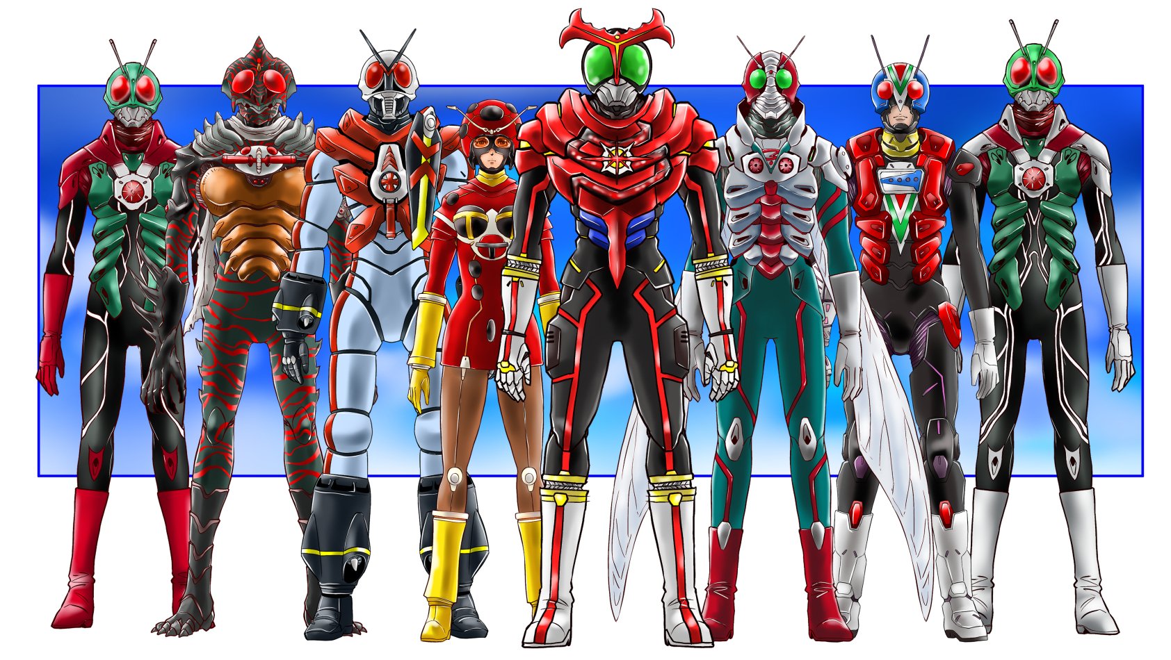 1girl 6+boys antennae armor belt bodysuit boots breasts bug electro_wave_human_tackle gloves glowing glowing_eyes green_armor green_eyes helmet highres horns kamen_rider kamen_rider_(1st_series) kamen_rider_1 kamen_rider_2 kamen_rider_amazon kamen_rider_amazon_(series) kamen_rider_stronger kamen_rider_stronger_(series) kamen_rider_v3 kamen_rider_v3_(series) kamen_rider_x kamen_rider_x_(series) kamen_rider_zeztz_(series) looking_at_viewer male_focus mask multiple_boys red_eyes red_scarf rider_belt riderman scarf single_horn solo standing taiga_hiroyuki tokusatsu typhoon_(kamen_rider)