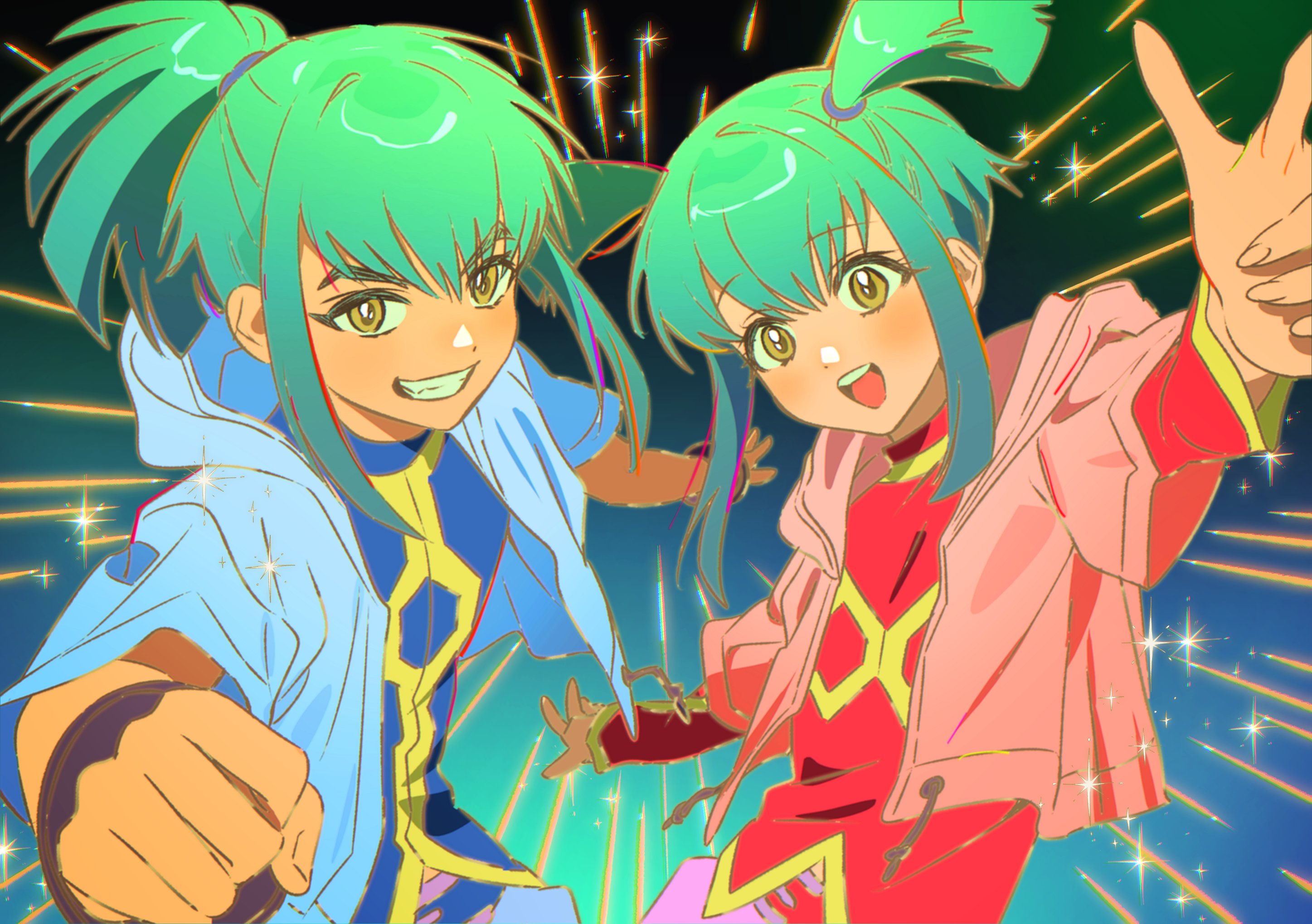 1boy 1girl blue_background blue_jacket blue_shirt blush brother_and_sister green_hair high_ponytail highres jacket lua_(yu-gi-oh!) luca_(yu-gi-oh!) ojing_oppa_(o_b_s_00) open_mouth parted_lips pink_jacket ponytail red_shirt shirt siblings smile teeth twins upper_body yellow_eyes yu-gi-oh! yu-gi-oh!_5d's