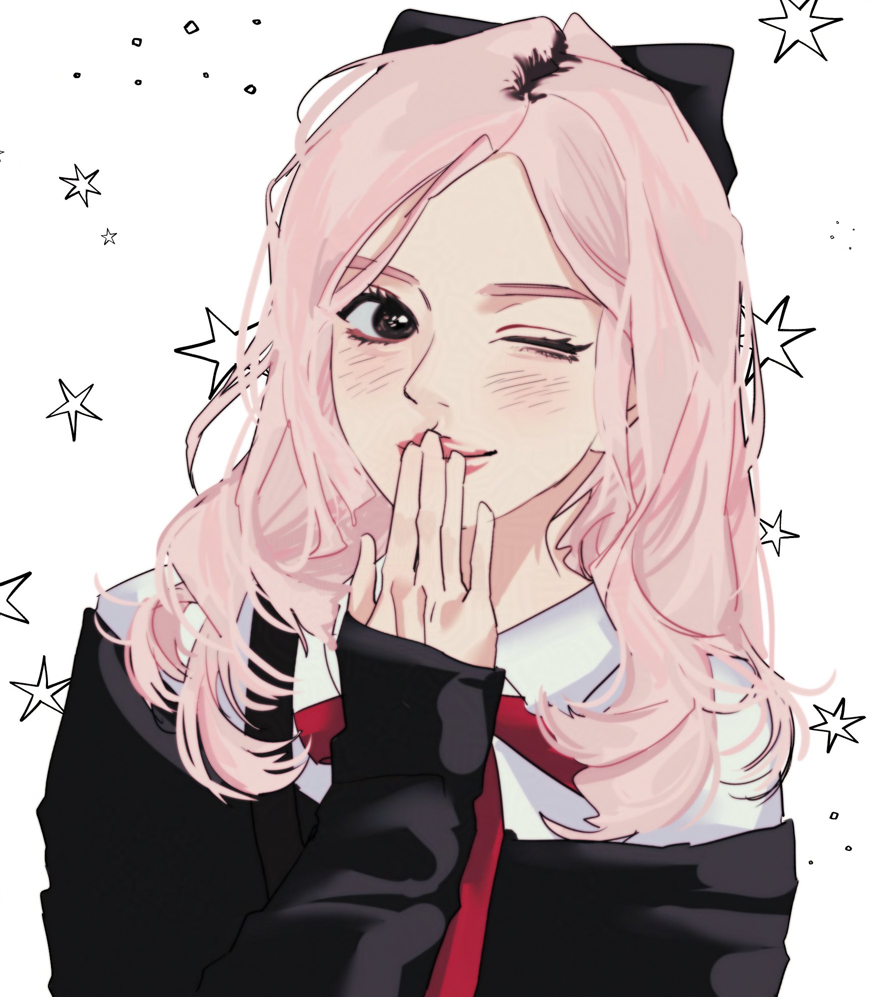 1girl anya_(spy_x_family) anya_(spy_x_family)_(cosplay) b_xbnh black_bow blush bow closed_mouth commentary_request cosplay eunha_(gfriend) gfriend hair_bow highres korean_commentary long_hair long_sleeves one_eye_closed parted_bangs pink_hair pink_lips real_life red_ribbon ribbon smile solo spy_x_family star_(symbol) upper_body very_long_sleeves viviz