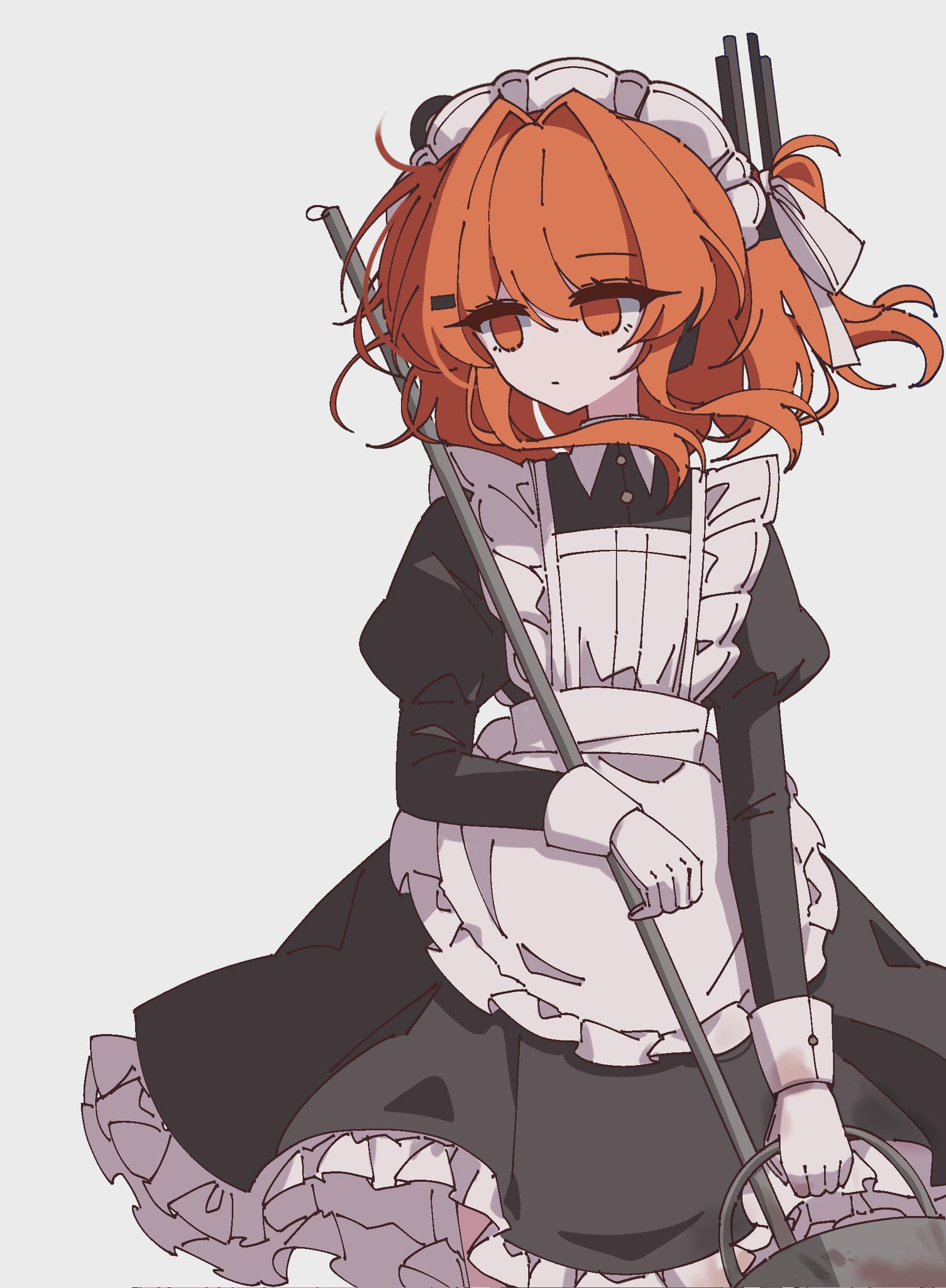 1girl a.i._voice adachi_rei alternate_costume apron black_dress bucket cowboy_shot dress enmaided frilled_apron frilled_dress frills gloves highres holding holding_bucket holding_mop long_sleeves maid maid_headdress mei_(meiday_mise) mop orange_eyes orange_hair simple_background solo standing utau white_apron white_background white_gloves