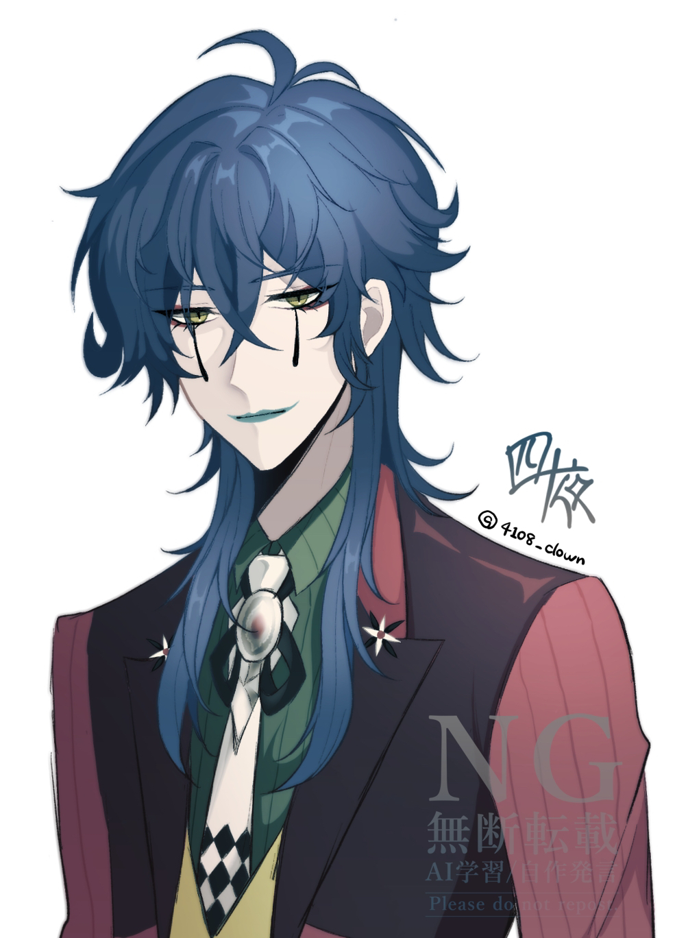 1boy blazer blue_hair blue_lips bolo_tie closed_mouth clown commentary_request crossed_bangs eyeshadow facial_mark green_shirt hair_between_eyes highres jacket ju_(mahjong_soul) long_bangs long_hair looking_at_viewer mahjong_soul makeup male_focus necktie red_eyeshadow red_jacket shirt simple_background smile solo teardrop_facial_mark tetra_c_xxx twitter_username upper_body vest watermark white_background white_necktie yellow_vest