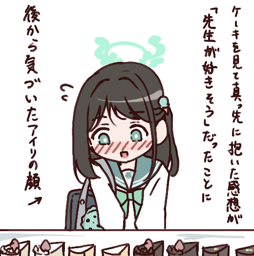 1girl airi_(blue_archive) arrow_(symbol) bag black_hair blue_archive blush bow cake cake_slice chibi flying_sweatdrops food green_bow green_eyes green_sailor_collar long_hair long_sleeves nose_blush one_side_up puffy_long_sleeves puffy_sleeves sailor_collar school_bag school_uniform serafuku shirt simple_background solo translation_request unadon_(unadoom) upper_body white_background white_shirt