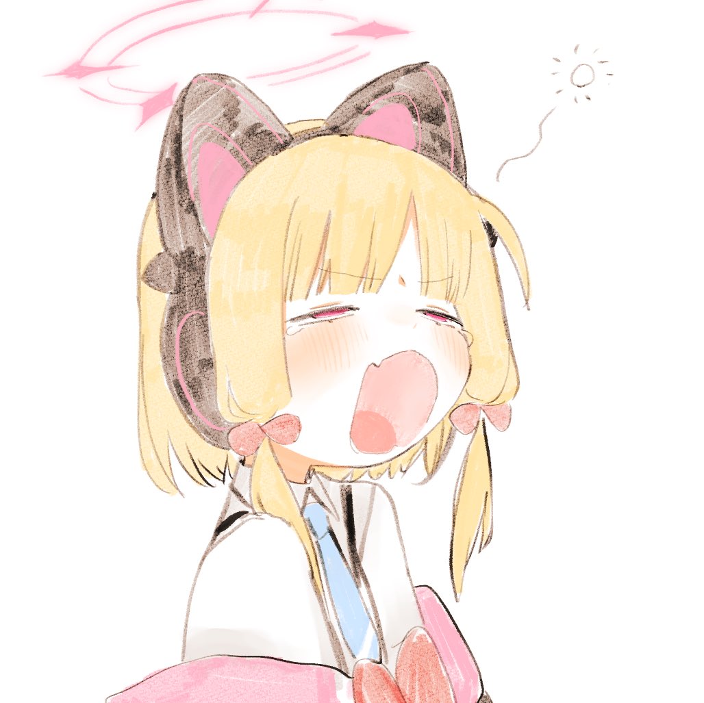 1girl animal_ear_headphones animal_ears blonde_hair blue_archive blue_necktie blush cat_ear_headphones cat_ears collared_shirt commentary fake_animal_ears fang hair_ribbon half-closed_eyes halo headphones momoi_(blue_archive) necktie open_mouth red_ribbon ribbon shinbashi_seiji shirt simple_background solo squeans untranslatable_commentary tongue upper_body white_background white_shirt yawning
