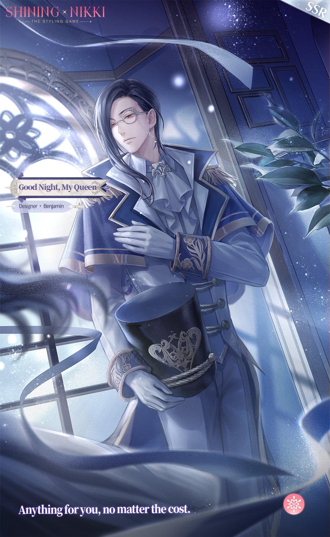 1boy 1girl artist_request ascot asymmetrical_bangs black_hair black_hat blue_coat blue_ribbon blue_vest character_name closed_mouth coat collared_shirt copyright_name suit_pants earrings english_text expressionless grey-framed_eyewear grey_ascot grey_pants hand_on_own_chest hat highres holding holding_unworn_clothes holding_unworn_hat indoors jewelry light_frown light_particles light_rays lilith_(shining_nikki) lips logo long_hair long_sleeves looking_at_another male_focus monocle moonlight night nightbane_(shining_nikki) nikki_(series) official_art open_clothes open_coat pants plant potted_plant red_eyes ribbon round_eyewear second-party_source shako_cap shining_nikki shirt sleeve_cuffs solo_focus unworn_hat unworn_headwear very_long_hair vest white_shirt window