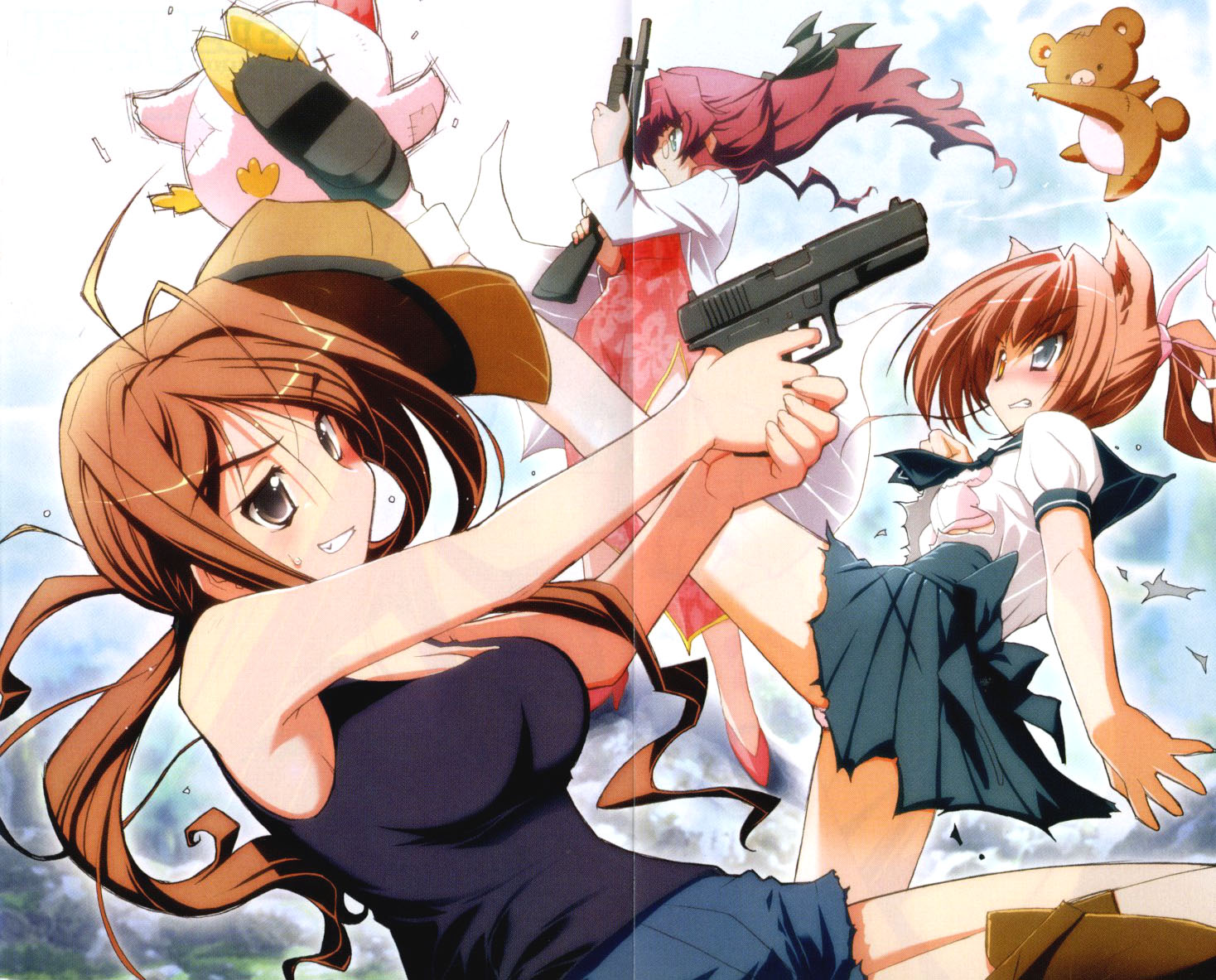 10s 3girls ai_(dragon_crisis!) akata_itsuki animal_ears bianca_alexandra_lou breasts brown_eyes brown_hair cleavage crease dragon_crisis! dress glasses glock green_eyes grin gun handgun heterochromia kicking large_breasts long_hair multiple_girls nanao_eriko non-web_source panties pink_hair pistol ponytail pump_action remington_870 scan school_uniform shotgun skirt smile torn_clothes underwear very_long_hair weapon wolf_ears