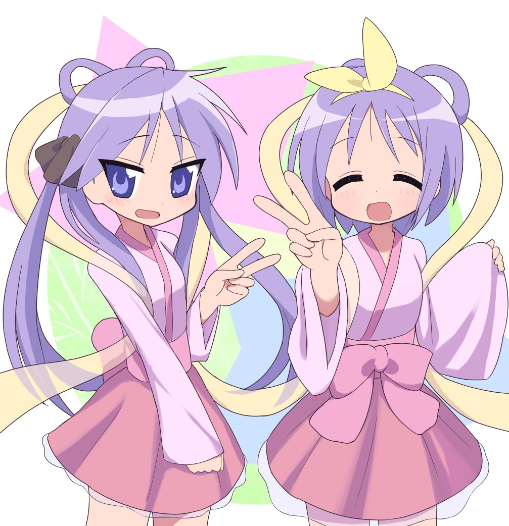 2girls birthday black_bow bow closed_eyes feixianji_(hairstyle) hagoromo hair_rings happy hiiragi_kagami hiiragi_tsukasa japanese_clothes kimono lucky_star multiple_girls onihoppe pink_bow pink_kimono pink_skirt purple_hair ribbon shawl skirt star_(symbol) tanabata tareme tsurime twintails v yellow_ribbon